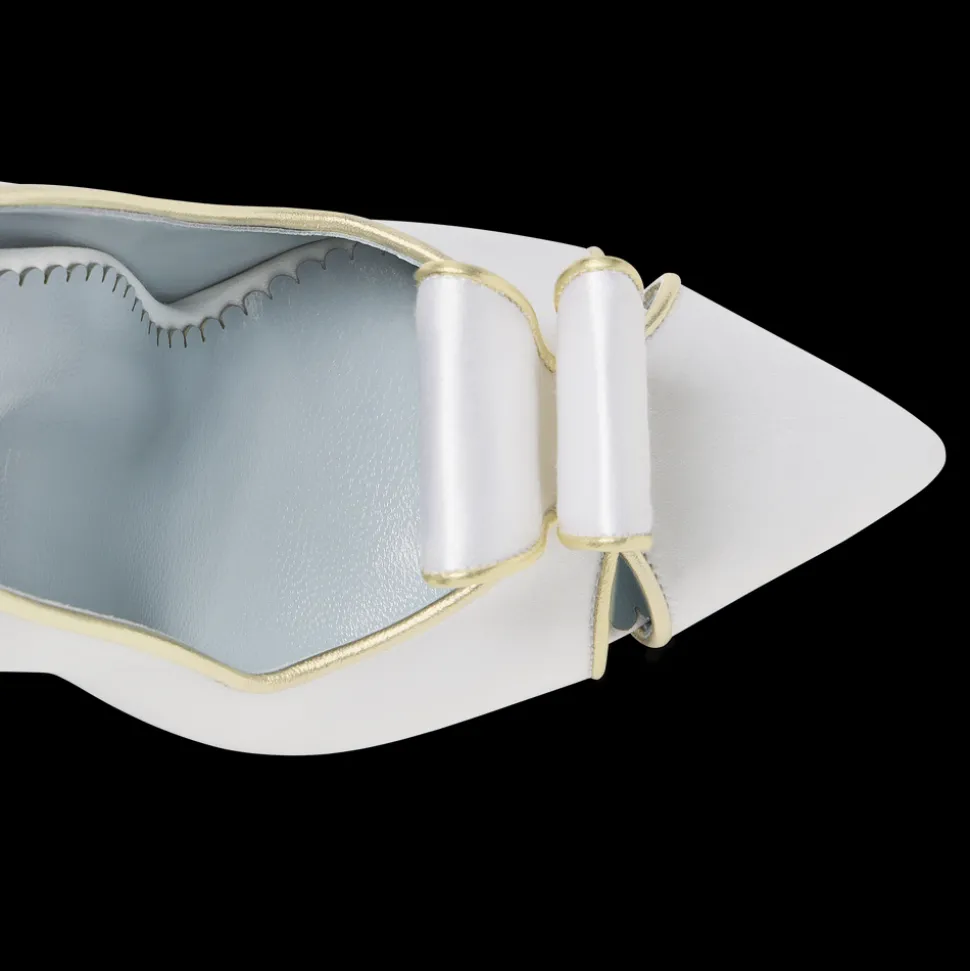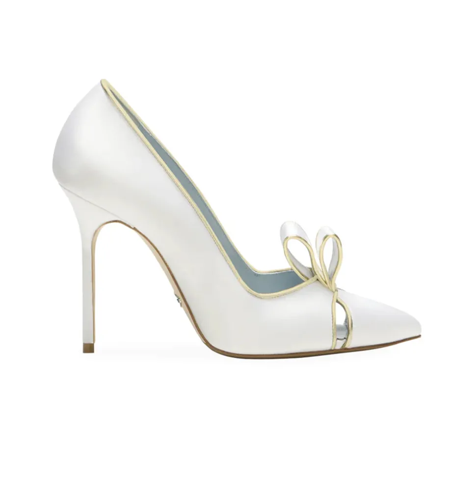 Sarah Flint sources the most exceptional materials from triple-dyed Italian suedes to jacquards woven in 300-year-old British mills. And once crafted 100% in Italy, shoes go through rounds of prototyping and fit-testing to ensure comfort and durability. The Nina is a standout pump heel in white satin, topped with an asymmetrical bow.