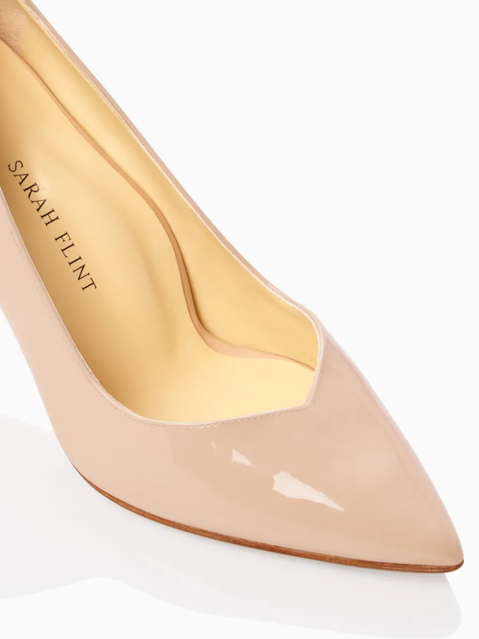 Sarah Flint sources the most exceptional materials from triple-dyed Italian suedes to jacquards woven in 300-year-old British mills. And once crafted 100% in Italy, shoes go through rounds of prototyping and fit-testing to ensure comfort and durability. Perfect Pump 85 in Light Sand Patent is a true classic, our bestselling style that has become synonymous with timeless elegance and exceptional comfort. Featuring a sleek stiletto heel and reimagined in glossy new light sand patent leather, this iconic pump effortlessly elevates any outfit. It blends a sophisticated silhouette with modern, comfort-focused details like arch support and a wider toe box, ensuring you look and feel your best from morning meetings to evening soirees.