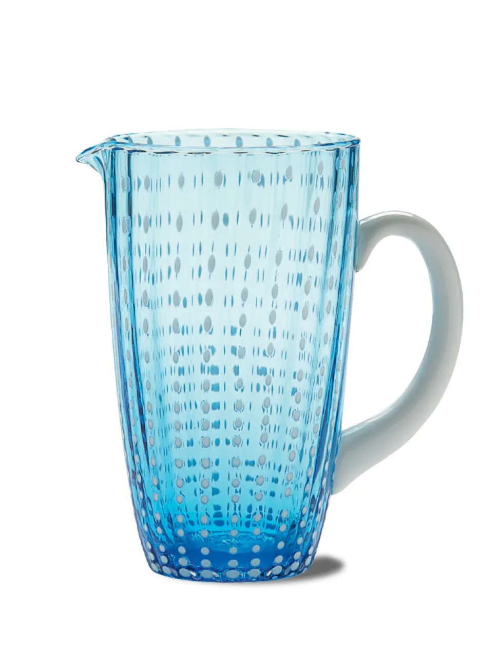 Zafferano lamps and glassware harness centuries of Murano craftsmanship, and hone it through the inimitable vision of Federico de Majo, giving these delicate, finely made pieces modern touches and endlessly stylish flair. Crafted in carefully colored transparent glass, the Perle Carafe features columns of carefully placed dots, which follow the pitcher’s curvature, adding both textual and visual elements to its resting elegance. You and your guests will love drinking from these glasses, which draw the eye on any table setting.