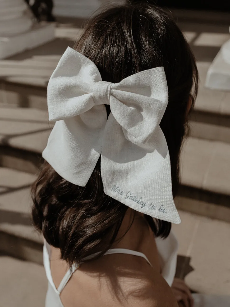 Built on the bonds of sisterhood, Gigi & Olive offers thoughtfully curated collections for brides-to-be from Georgie Le Roux and her sister Olivia. Offering everything from personalized hats to table linens, with a gorgeous embroidery service, the brand’s veils, hair bows, scrunchies, handkerchiefs and garters are at original, fashionable, and aspirational. This gorgeous, chunky slightly off-white linen bow is effortless and chic, no matter the occasion. Choose to add personalization across one or both of the bottom of the tails.