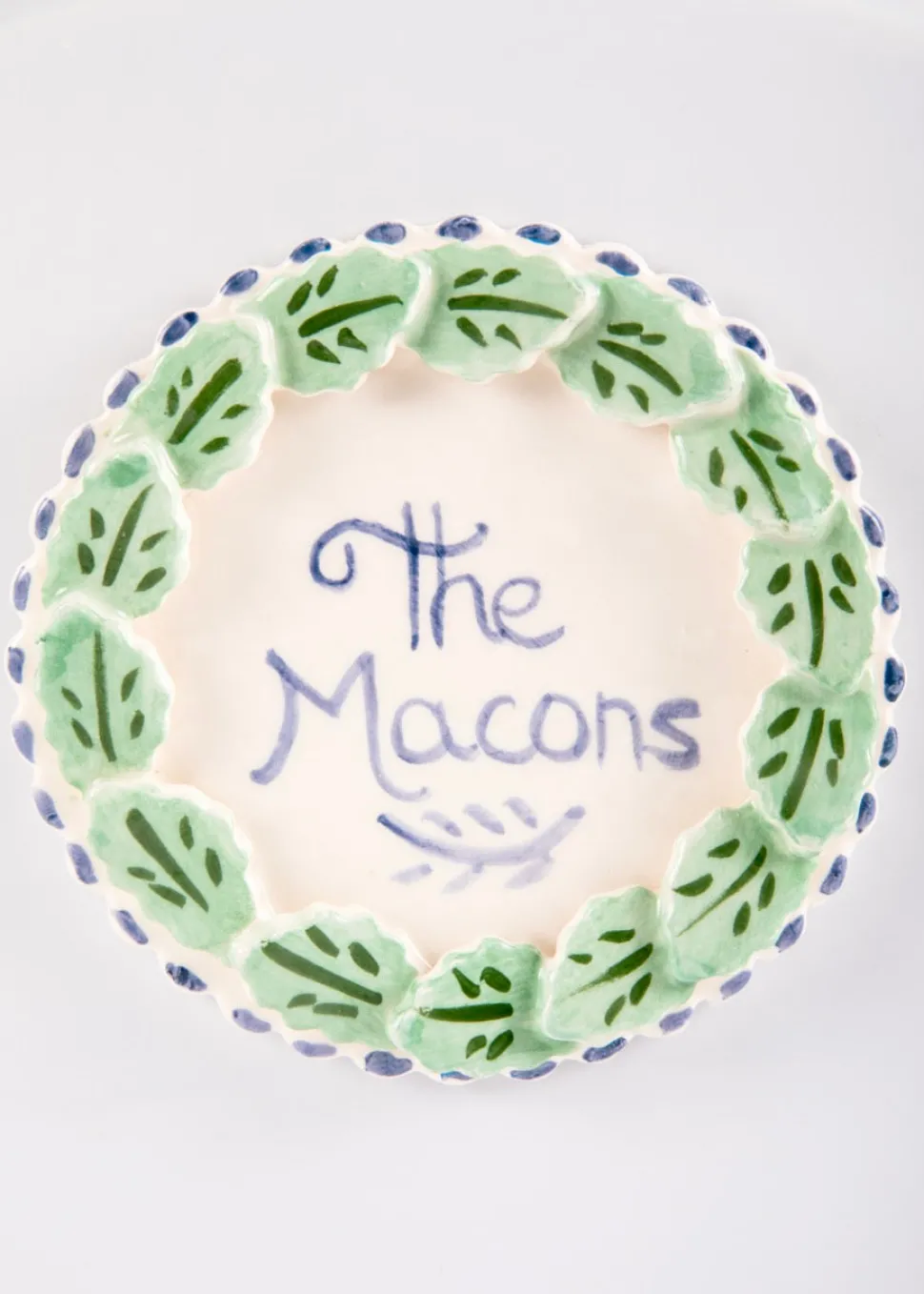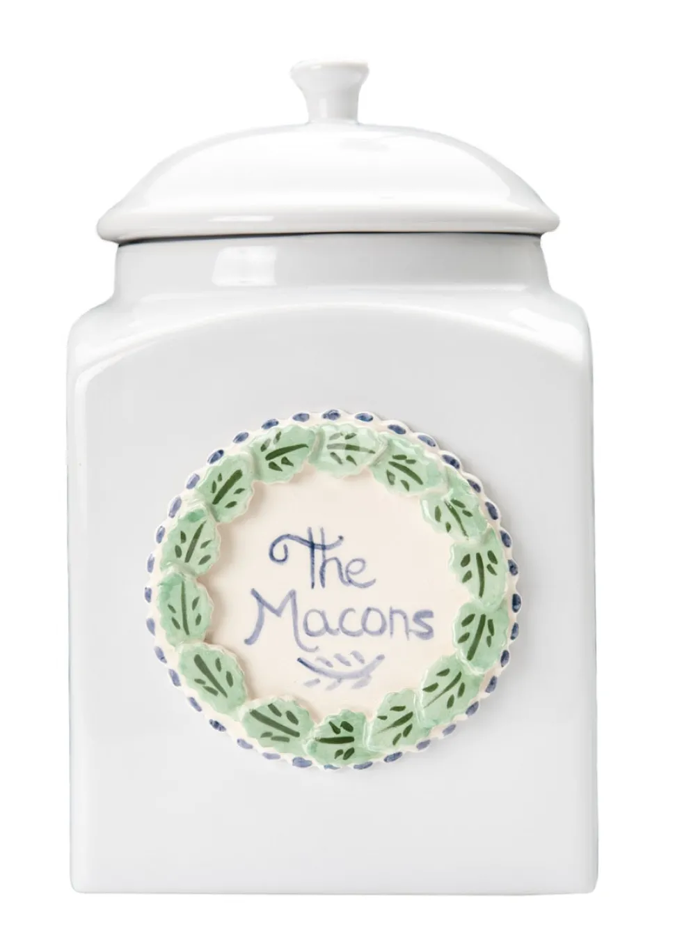 Self-taught artist Tricia Lowenfield crafts one-of-a-kind whimsical pieces that will become family treasures in time. Entirely handmade and completely charming, this custom Wreath cookie jar will keep every guest coming back for more.