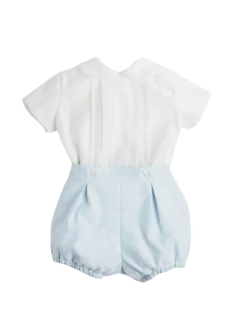 Renowned for exceptional craftsmanship and timeless design, Pepa London creates traditional childrenswear to be treasured and passed down. Each piece reflects the brand’s belief in dressing children like children, combining British style with refined details, comfort, and enduring elegance. The Peter Pan Collar Two Piece Set in Pale Blue is a beautifully tailored christening ensemble, featuring a softly paneled shirt with delicate antique lace overlay and a classic Peter Pan collar. The matching bloomers attach with covered buttons, creating a sweet and polished heirloom look.