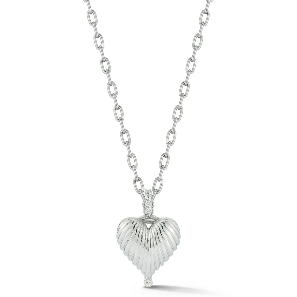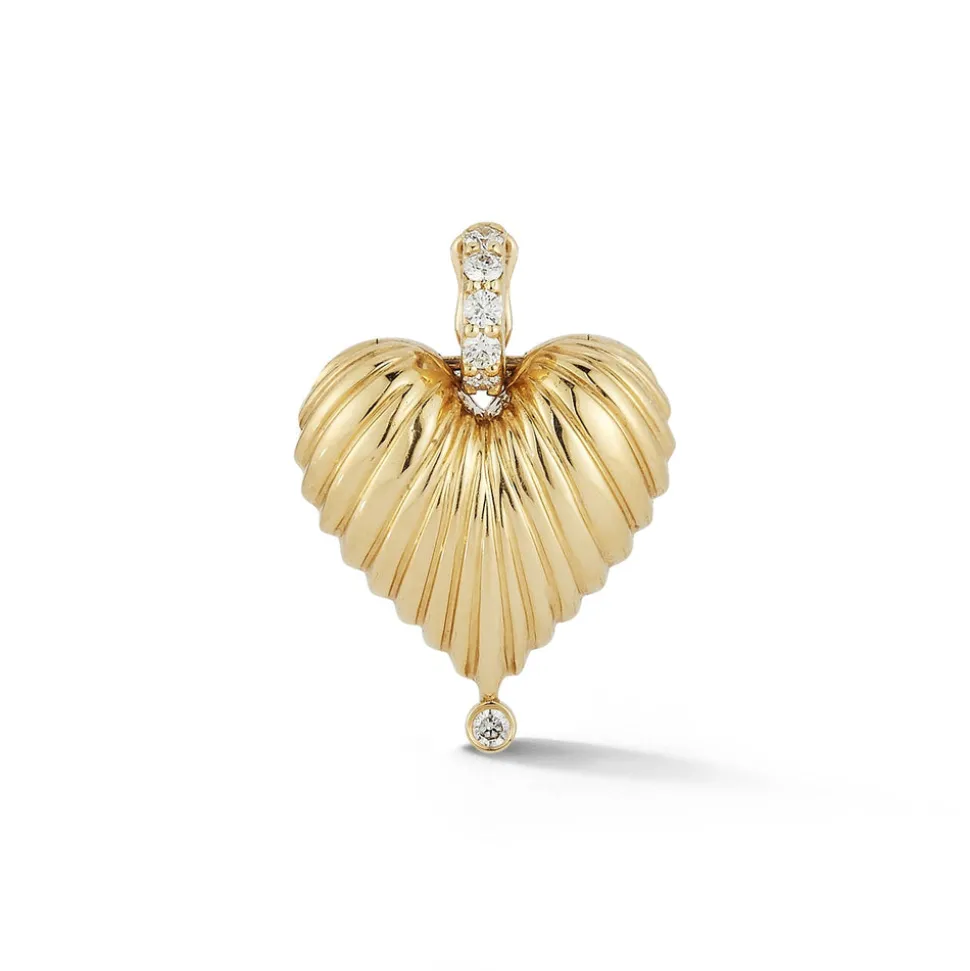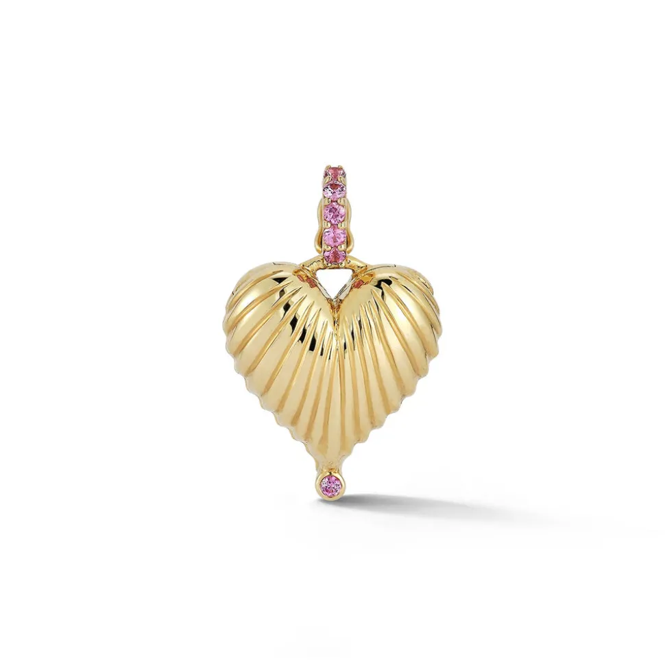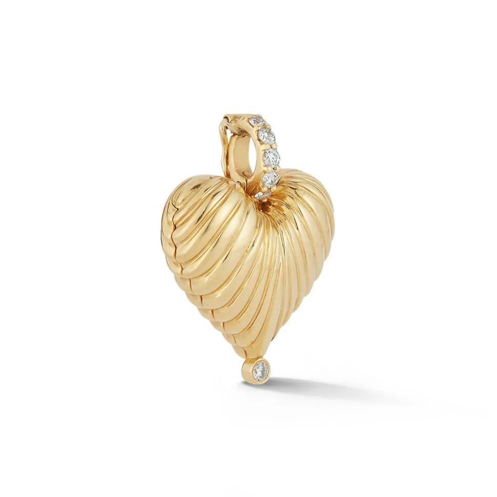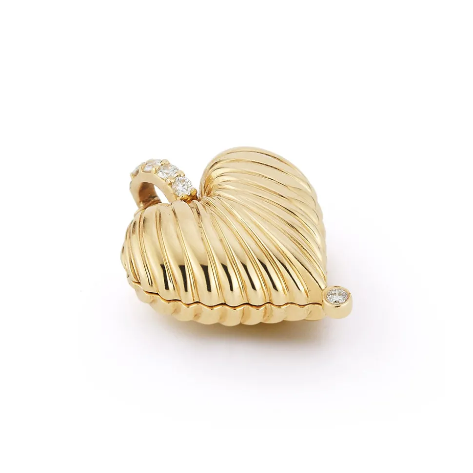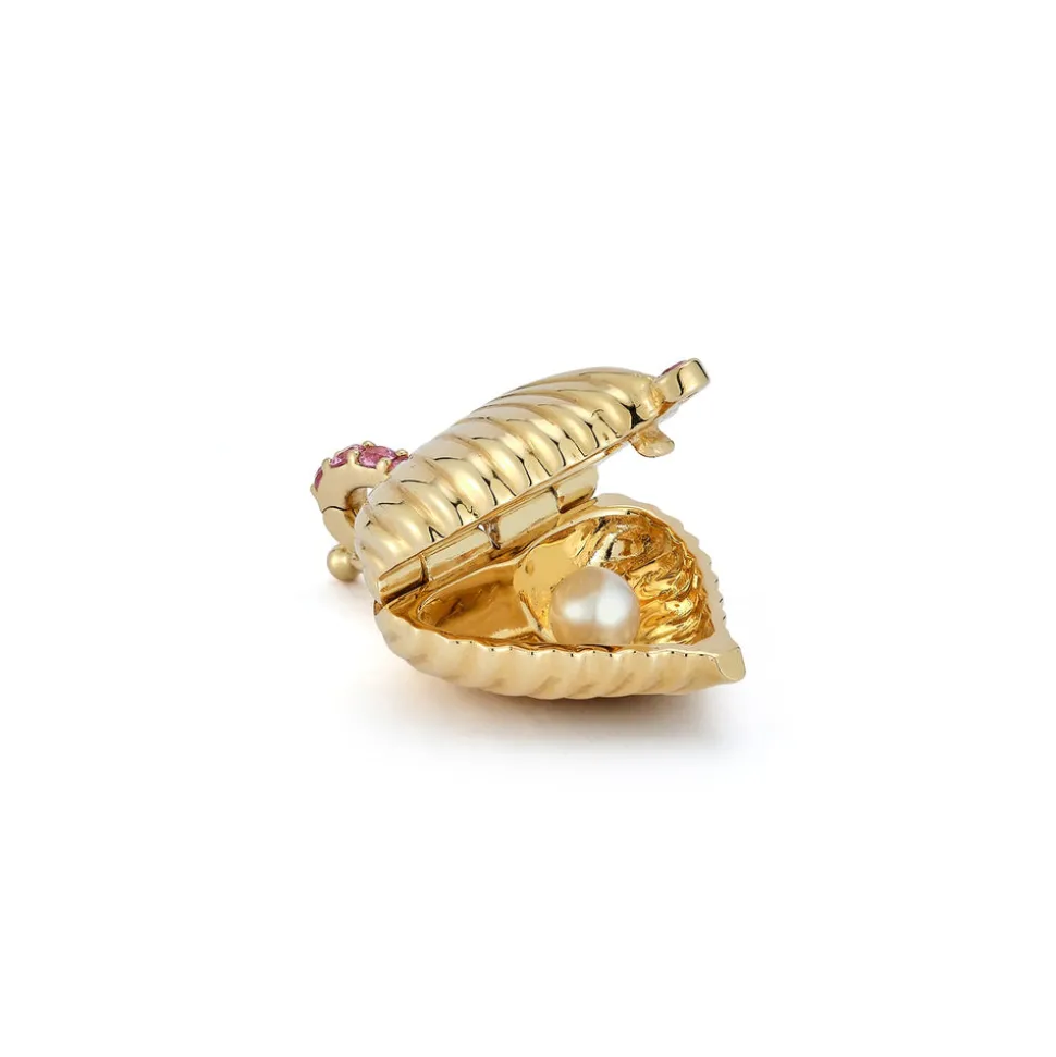 Inspired by her mother, who made golden jewelry from shells found near their home in Southern California, Renna Brown-Taher creates jewels of exquisite quality from the natural world, with minimal impact upon it. The Open Heart Locket is whimsical luxury at its finest. The locket opens to reveal a glistening pearl carefully held inside, while the clasp and chain loop feature precious stones.