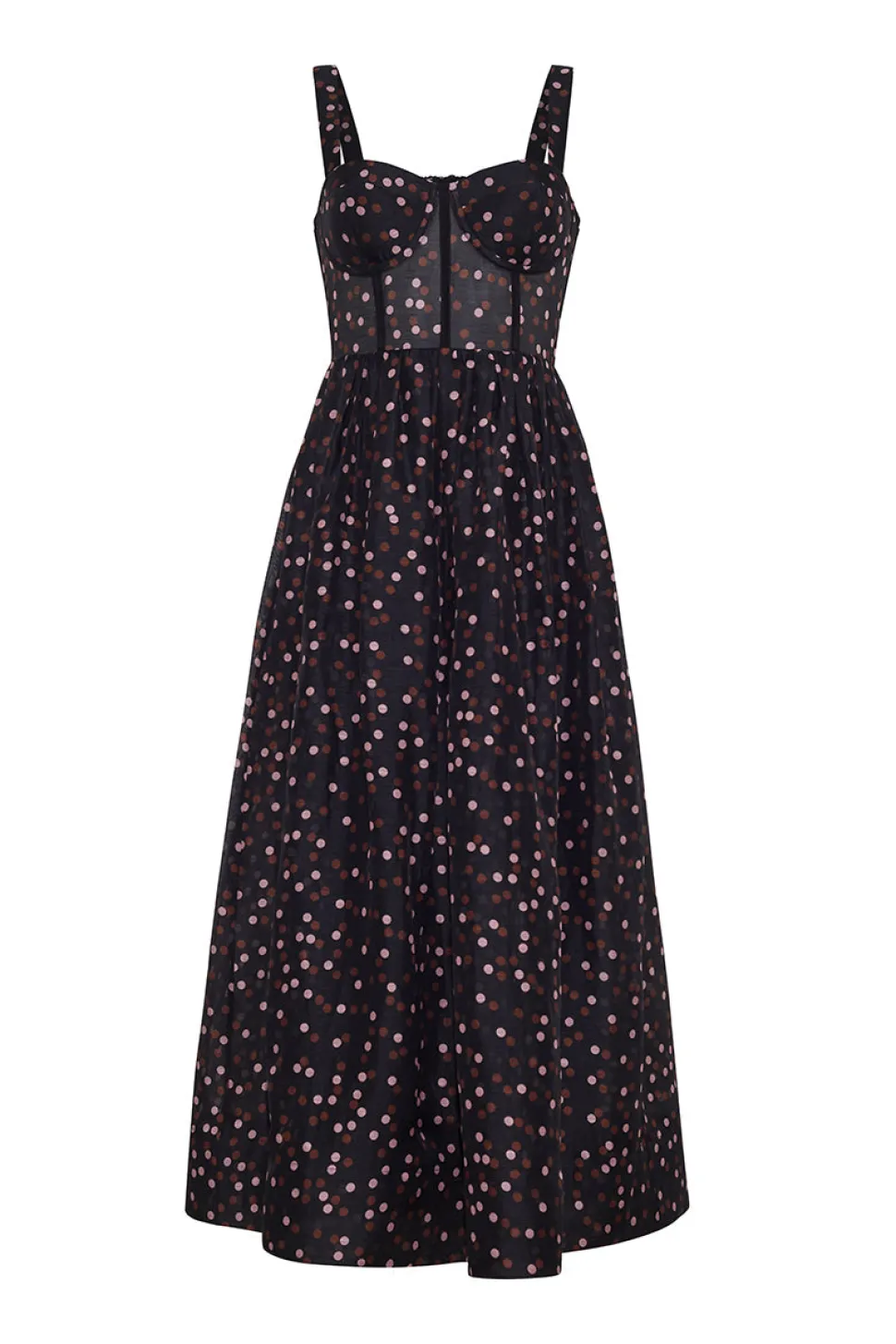 Founded by three New York City-based mothers who met through their kids, Cara Cara’s hallmarks include crisp poplin, house-designed prints, and casual glamour. The inspiration for their ethical womenswear comes from interior design, as well as the world’s most exotic locales. The Phoebe Midi in Stamped Dot Black embodies modern romance with a structured yet playful silhouette. This bustier-style dress features a fitted bodice with exposed boning, a smocked back panel for comfort, and a voluminous puff skirt with gathered detailing. Finished with delicate straps and practical pockets, it captures the brand’s effortless blend of polish and ease.