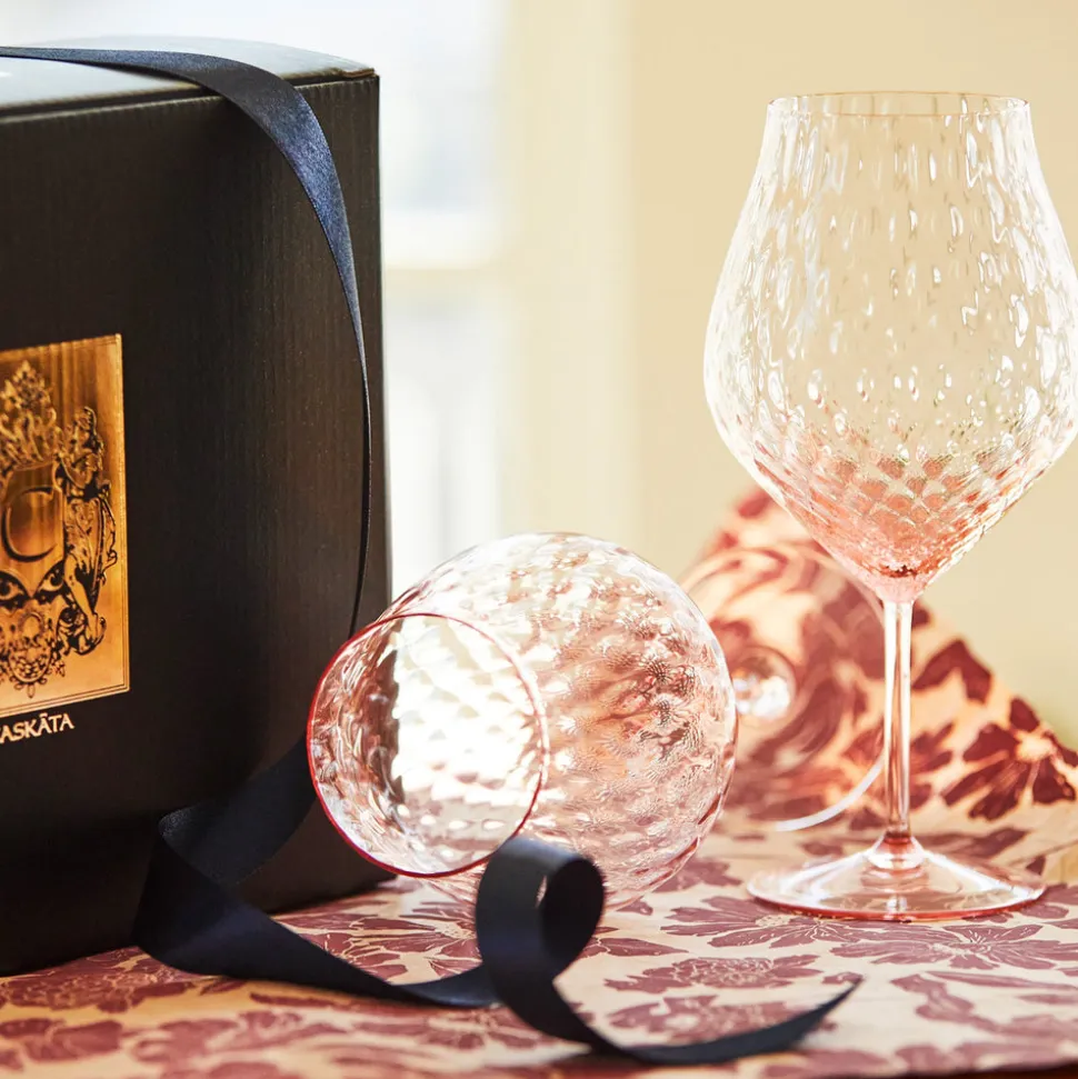 Caskata makes dinnerware for those who love to entertain. That joie de vivre and celebratory atmosphere makes its way into each piece of the brand’s blend of classic and contemporary designs, recognizable by their creative patterns, enduring quality, and light touch. The Phoebe collection is for non-traditionalists, those who enjoy an eye-catching pattern and dramatic curves. The Phoebe Rose Universal Wine Glasses, Set of 2, feature a wide base, tapered mouth and tulip shape. An ideal vessel for your favorite vintage, or even just a cool glass of water.