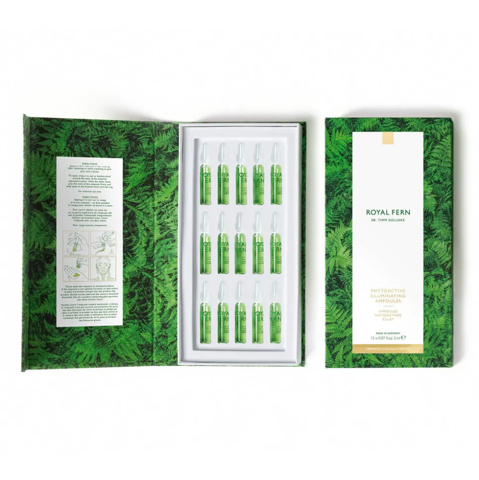 Royal Fern skincare sources ingredients from its namesake plant, which has survived for over 400 million years, staying evergreen, and resistant to UV radiation and environmental pollution. Harness its comprehensive protection mechanism and employ its cellular defense boosting properties with products at the intersection of nature’s wonder and cutting-edge cosmetic science. Phytoactive Illuminating Ampoules contain highly concentrated plant-based active ingredients which gently lighten the skin and give it a lasting glow. Excessive pigment production is reduced, collagen synthesis is stimulated. Additionally, hyaluronic acid and niacinamide optimize the balance of your skin’s moisture, making it appear visibly plumper, smoother, and more even.