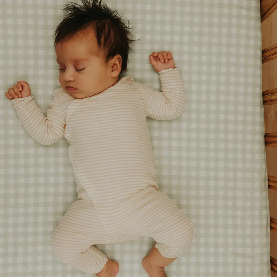 Inspired by Hygge—a Scandinavian concept that emphasizes the innate contentment arising from a cozy and comfortable atmosphere—Gooselings offers serene essentials for children and babies that bring stylish serenity to any space they touch. The Picnic Gingham Crib Sheet in Green is made from cotton sateen, a silky-soft weave prized for its smooth texture and breathability. OEKO-TEX certified and woven from the purest materials, this sheet brings both comfort and playful charm to the nursery, ensuring restful sleep in style.