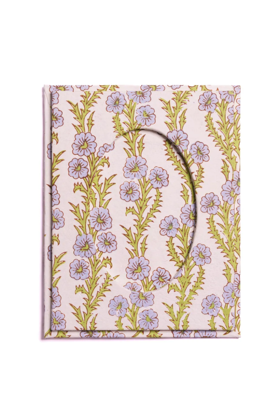 Handcrafted by artisans in Jaipur using traditional block-printing techniques. Made from 100% recycled cotton handmade paper. Features a circular opening for a 4″ x 6″ photograph.