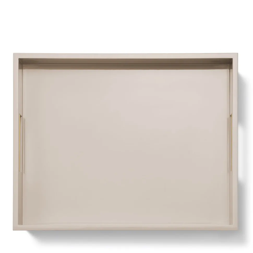 Effortless, beautiful living is whatâ important to Aerin Lauder. That ease and refinement shines through in every detail of her collections of beauty products, home decor, and fashion accessories.ÂCrafted with a sleek lacquer finish,ÂPiero Lacquer Tray in Taupe boasts integrated brass handles, which elevate its clean, minimalist lines, making it a stylish tray for entertaining.