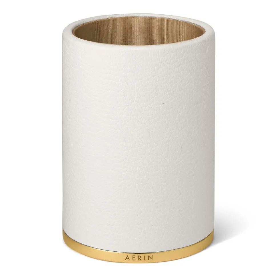 Effortless, beautiful living is what’s important to Aerin Lauder. That ease and refinement shines through in every detail of her collections of beauty products, home decor, and fashion accessories. Keep your desk organized with the stylish Piero Leather Pencil Cup in Italian grained leather, further enhanced with brass detailing at the base. This piece is lined in moire fabric for easy cleaning. It makes a wonderful gift for someone with a home office.