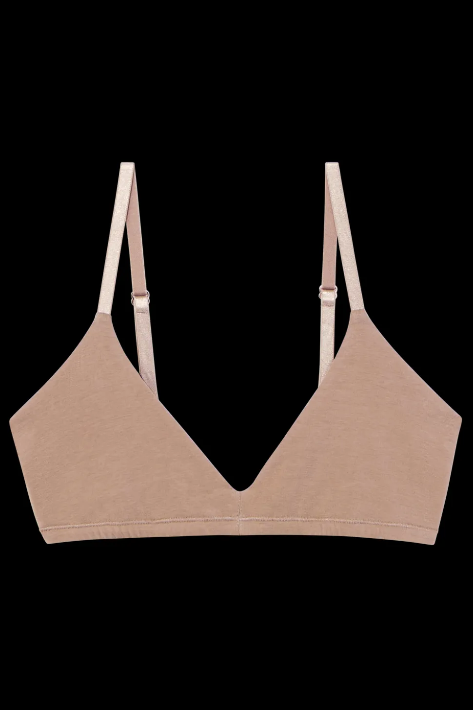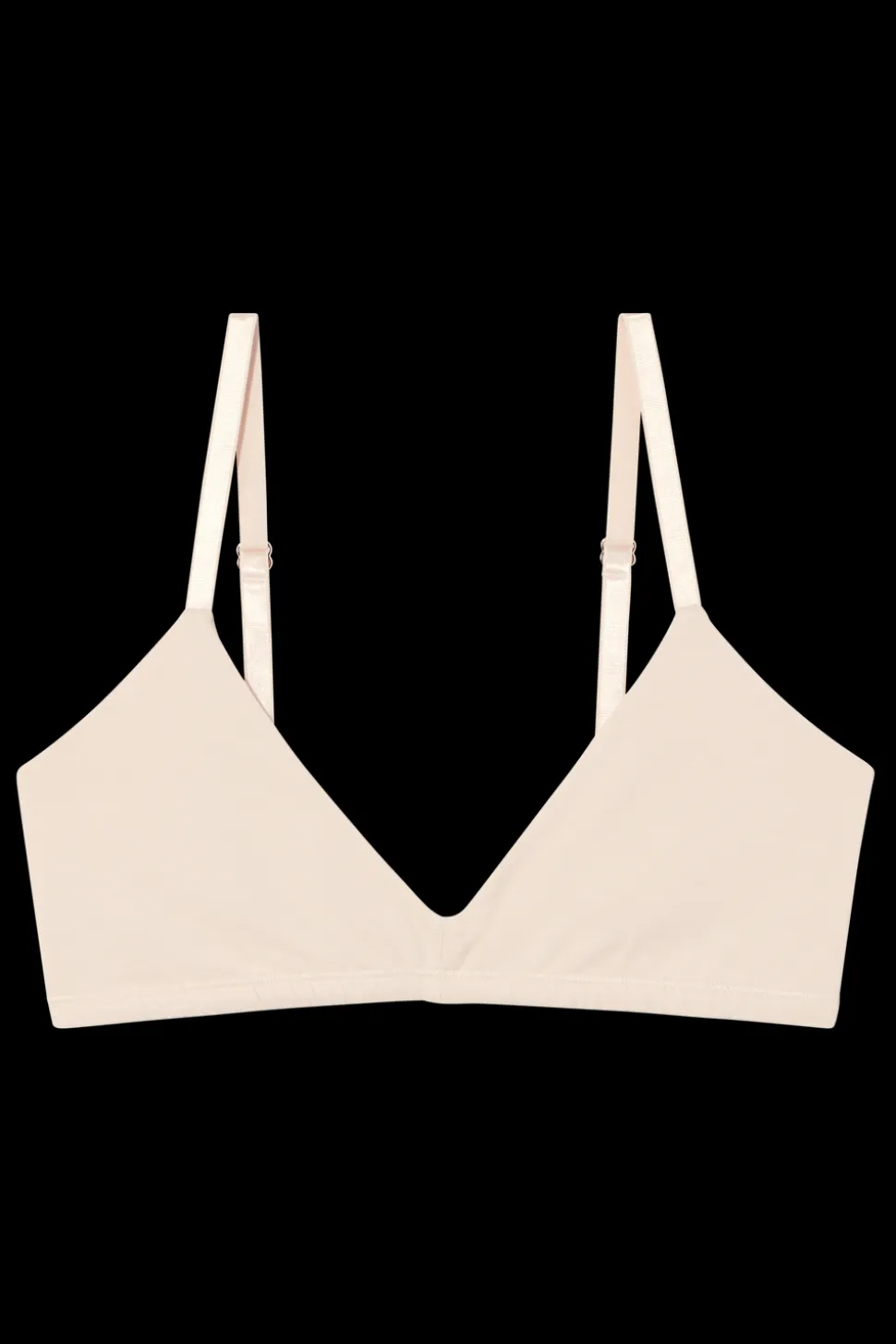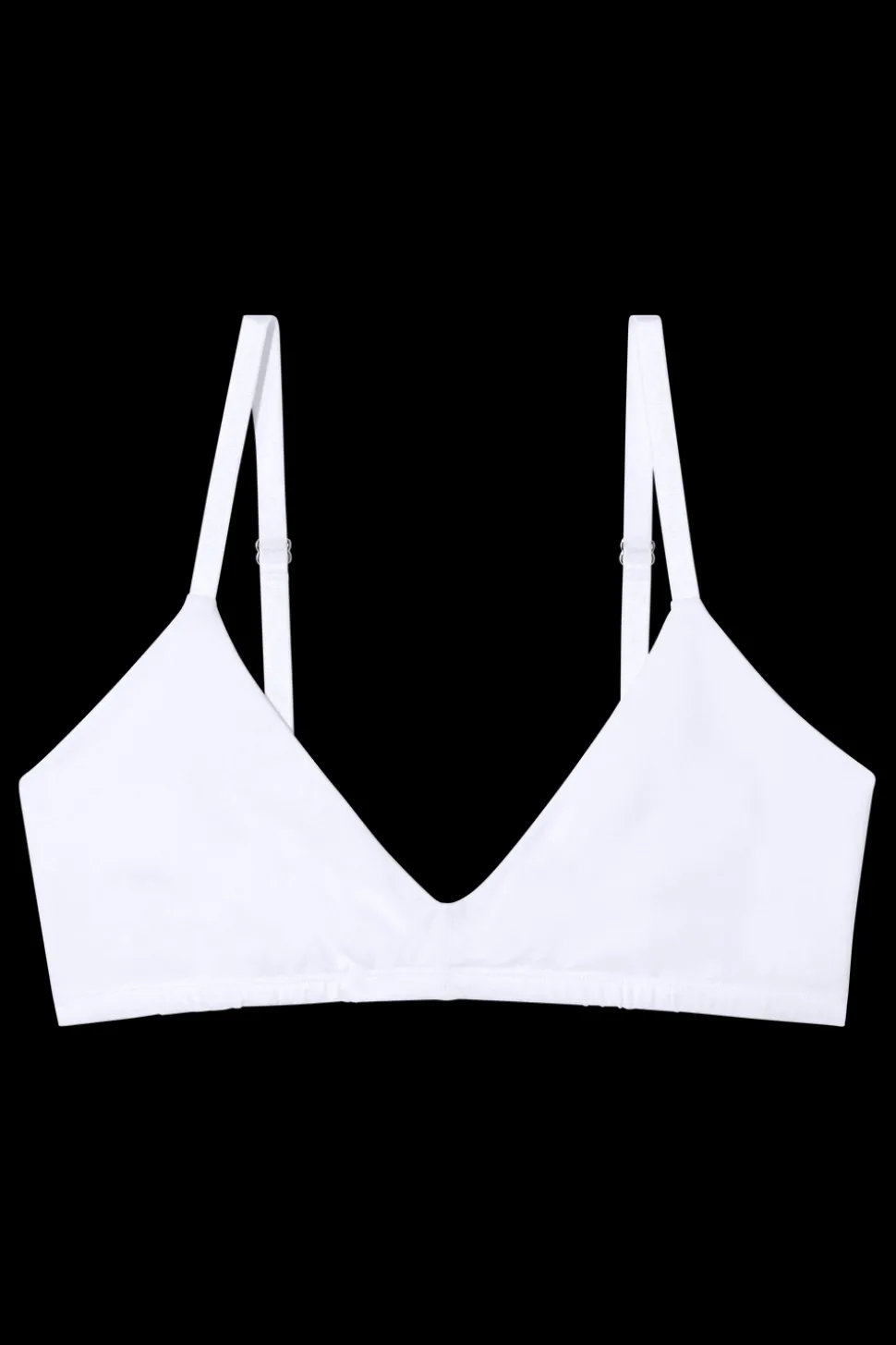 47% pima cotton, 46% cotton, 7% spandex. Natural support bralette. Adjustable straps. Hook-and-eye closure.