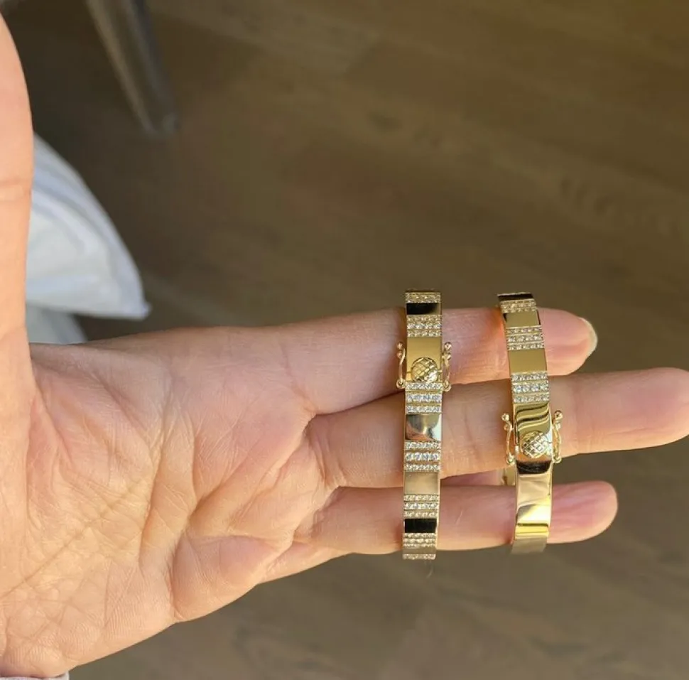 Luxury jewelry for the modern woman, Ri Noor incorporates intriguing into their truly unique designs. No matter what the occasion, these bold and vibrant rings, bracelets, necklaces, and earrings impart a sense of heightened classics, wherein the gems’ organic shapes meet precise settings of silver or gold, and timeless style. The Pinstripe Strength Diamond Bangle Bracelet with Pave Diamonds boasts highly polished 18k yellow gold, hand-set brilliant cut diamonds, and pave diamonds forming a pinstripe pattern. Bold and heavy, this is a stackable bracelet that can also work beautifully on its own.