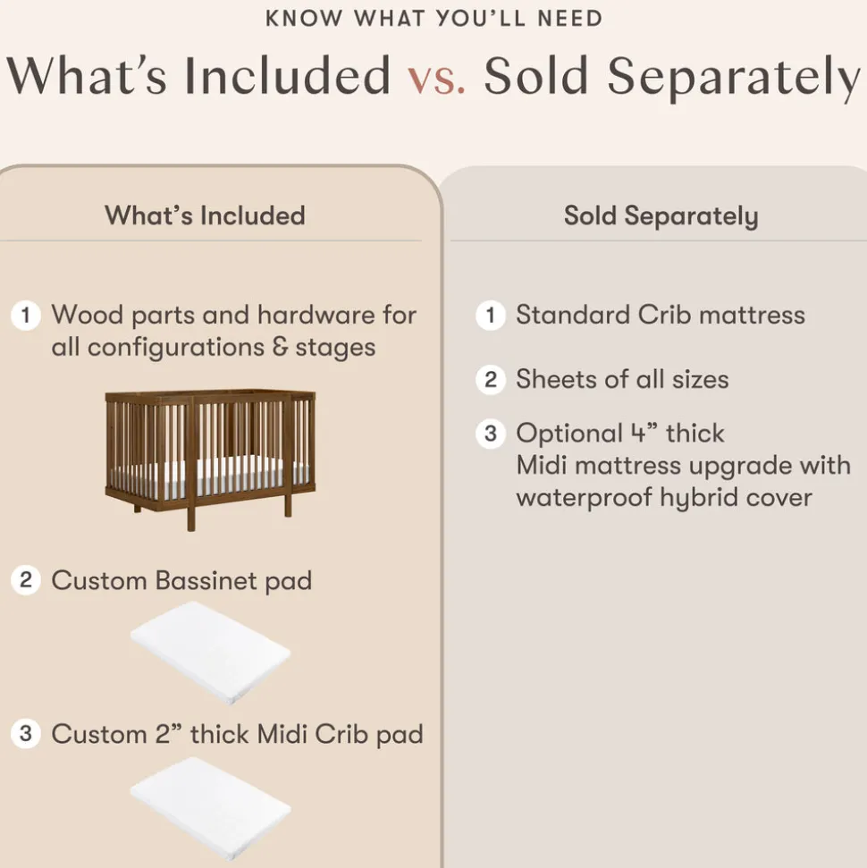 Natural walnut finish. Made with FSC®-certified sustainable New Zealand pine wood. GREENGUARD Gold Certified. Finished in a non-toxic multi-step painting and staining process that is lead and phthalate safe. Includes all conversion kits: bassinet, midi crib, full-size crib, toddler bed, daybed, and junior bed configurations. Two adjustable mattress height positions for each stage. Meets ASTM International and U.S. CPSC safety standards.
