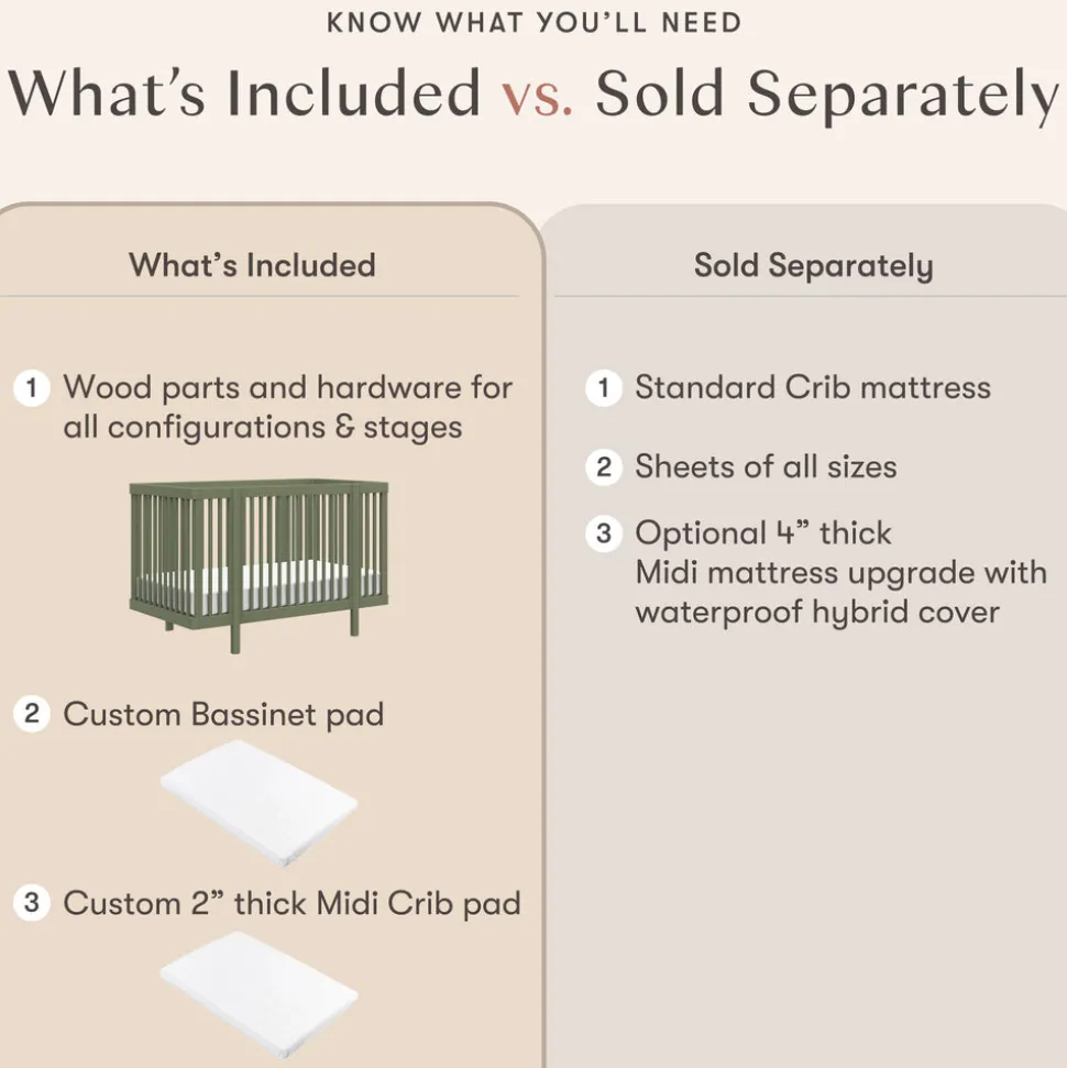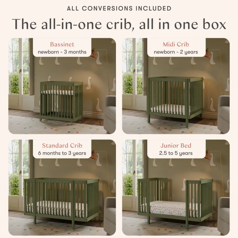 Olive finish. Made with FSC®-certified sustainable New Zealand pine wood. GREENGUARD Gold Certified. Finished in a non-toxic multi-step painting and staining process that is lead and phthalate safe. Includes all conversion kits: bassinet, midi crib, full-size crib, toddler bed, daybed, and junior bed configurations. Two adjustable mattress height positions for each stage. Meets ASTM International and U.S. CPSC safety standards.
