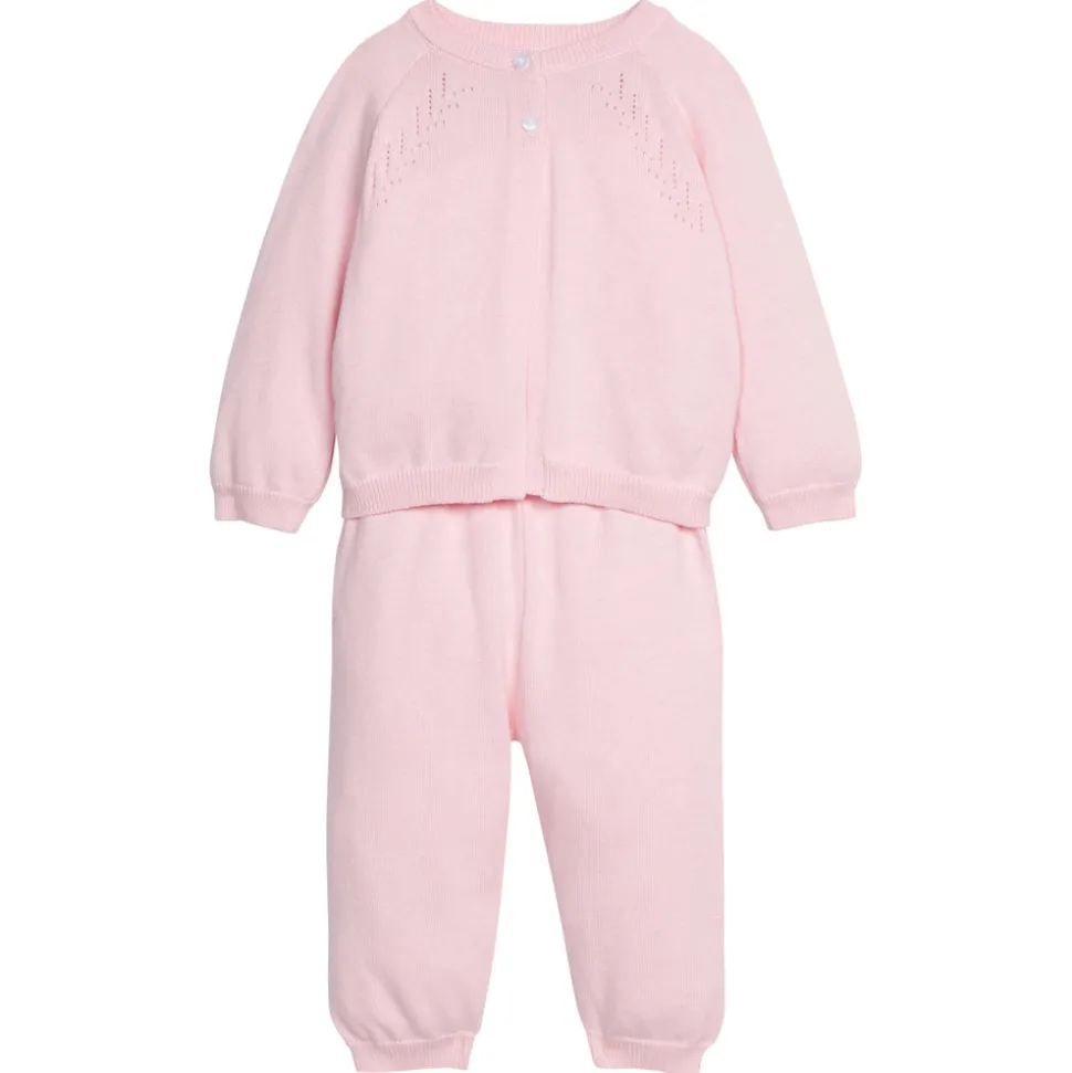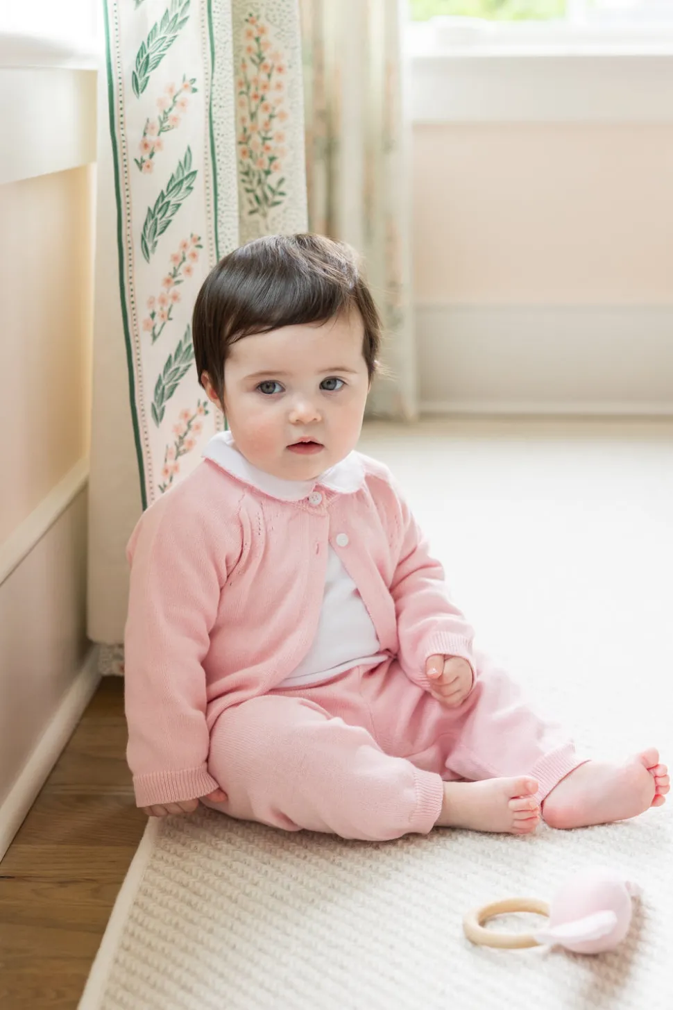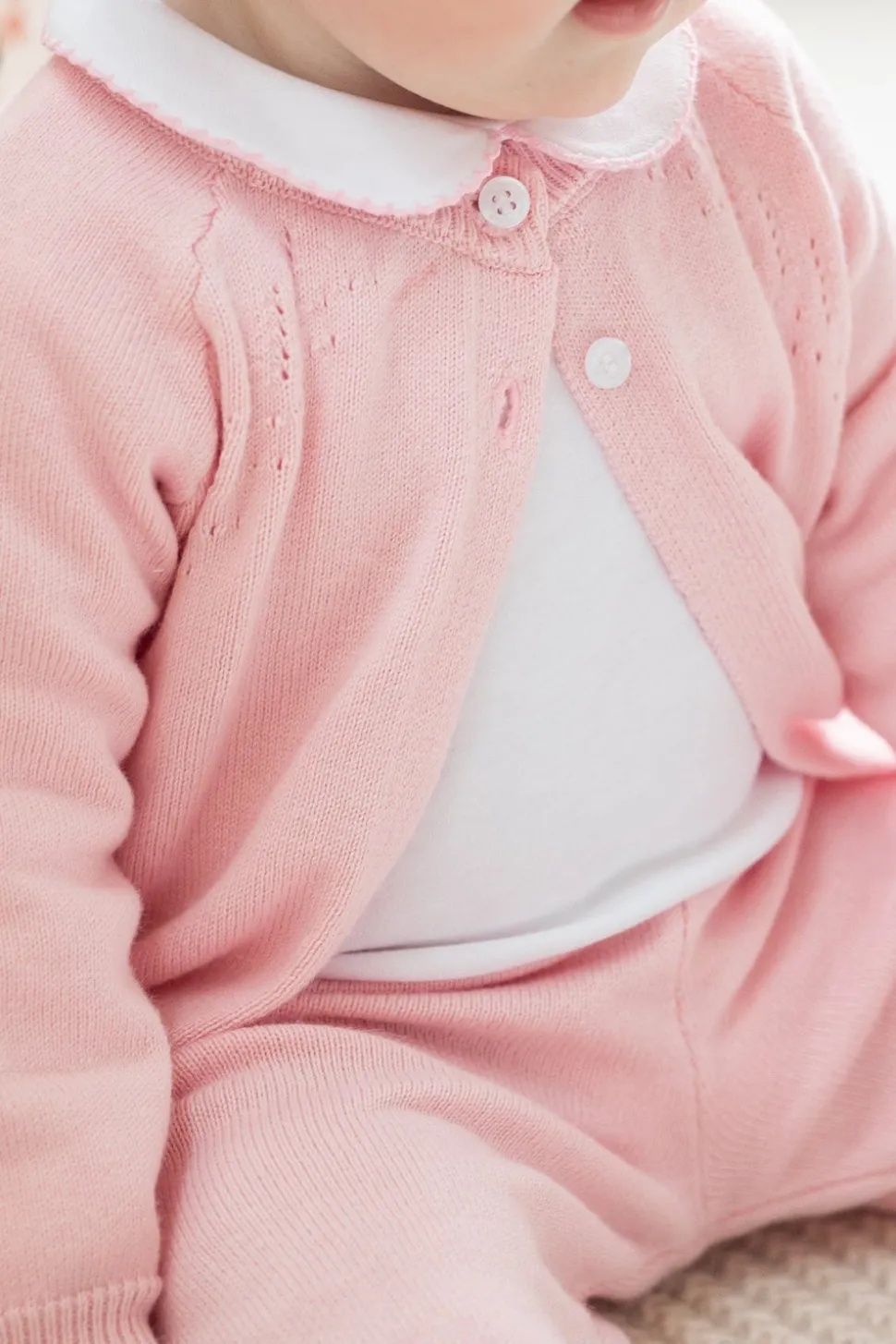 Shannon Latham founded Little English in 2004 with the belief that children should always be well-dressed. Employing hand-smocking, hand-embroidery, and the very best fabrics, Shannon and her daughter design timeless pieces that will be worn for generations to come. The Pointelle Knit Set in Light Pink keeps little ones cozy and comfortable in colder weather, knit in soft Peruvian cotton. This two-piece set includes a cardigan with button closures and matching pull-on pants, offering both warmth and charm. Pair it with a Picot Trim Peter Pan Onesie for a classic look for your littlest love.