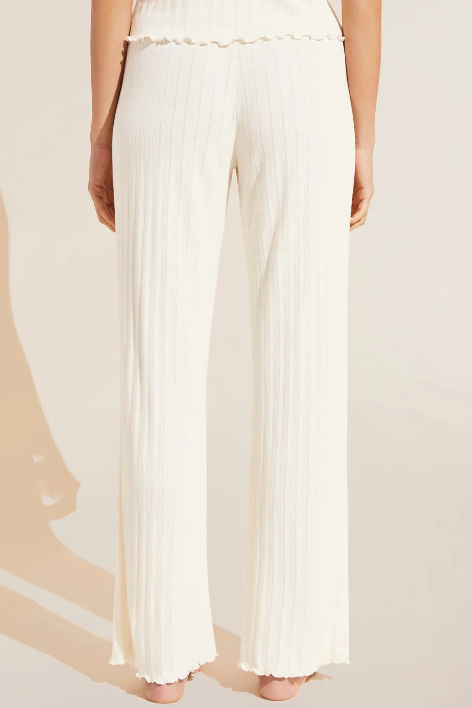 In 1996, Eberjey co-founders Ali and Mariela understood the visceral desire for beautiful, functional sleepwear that supported sleep and individual style. At last, pajamas can be sensual, comfortable, tailored, and effortless. Embrace the relaxed feel of the mid-rise Pointelle Pant in Ivory, complete with an elastic waistband for easy wear. Whether you’re striking a pose in yoga class, enjoying a casual coffee catch-up, or strolling with your furry friend, these pants offer a flattering fit with a touch of feminine flair, courtesy of the lettuce edge hem.