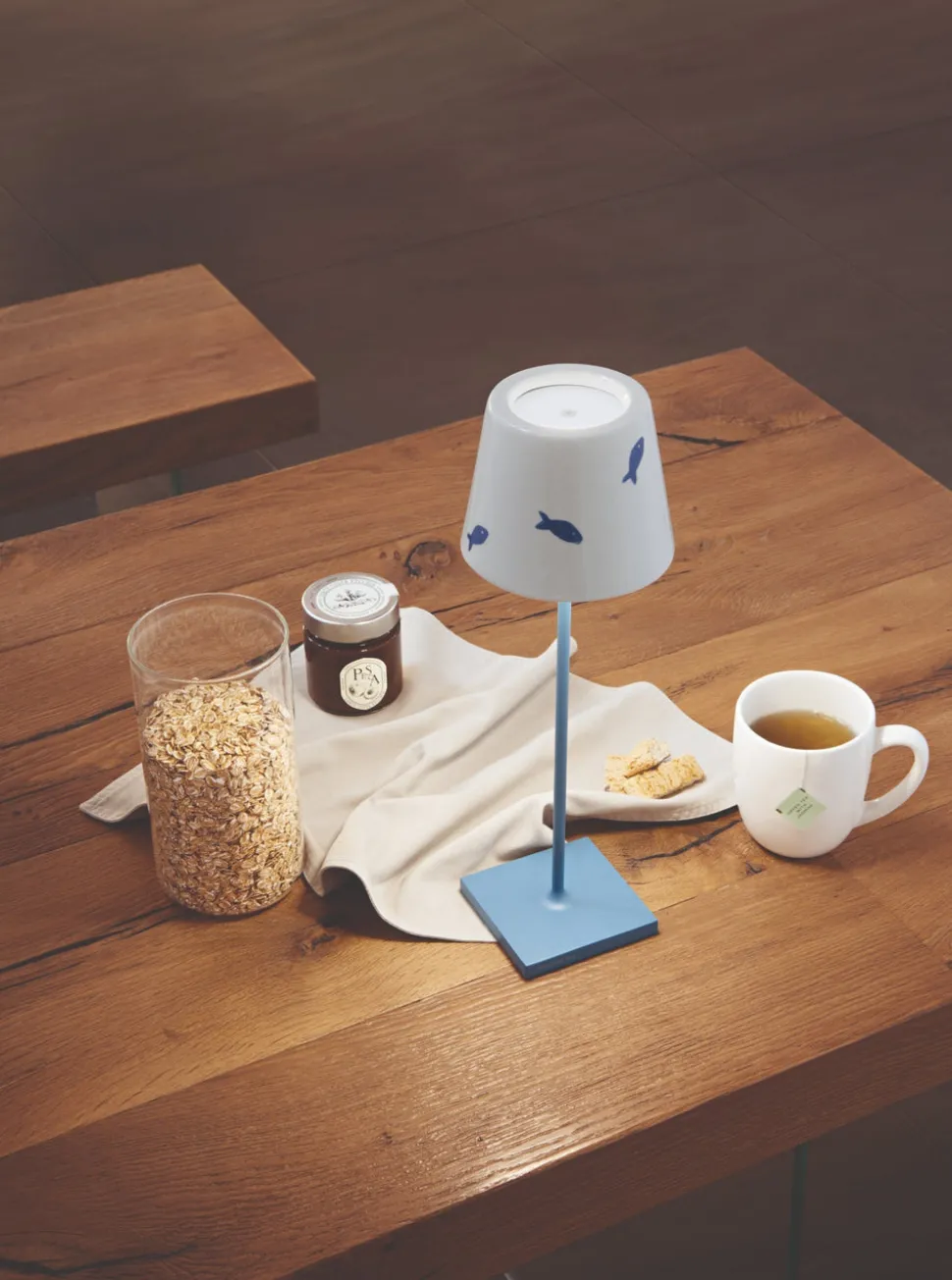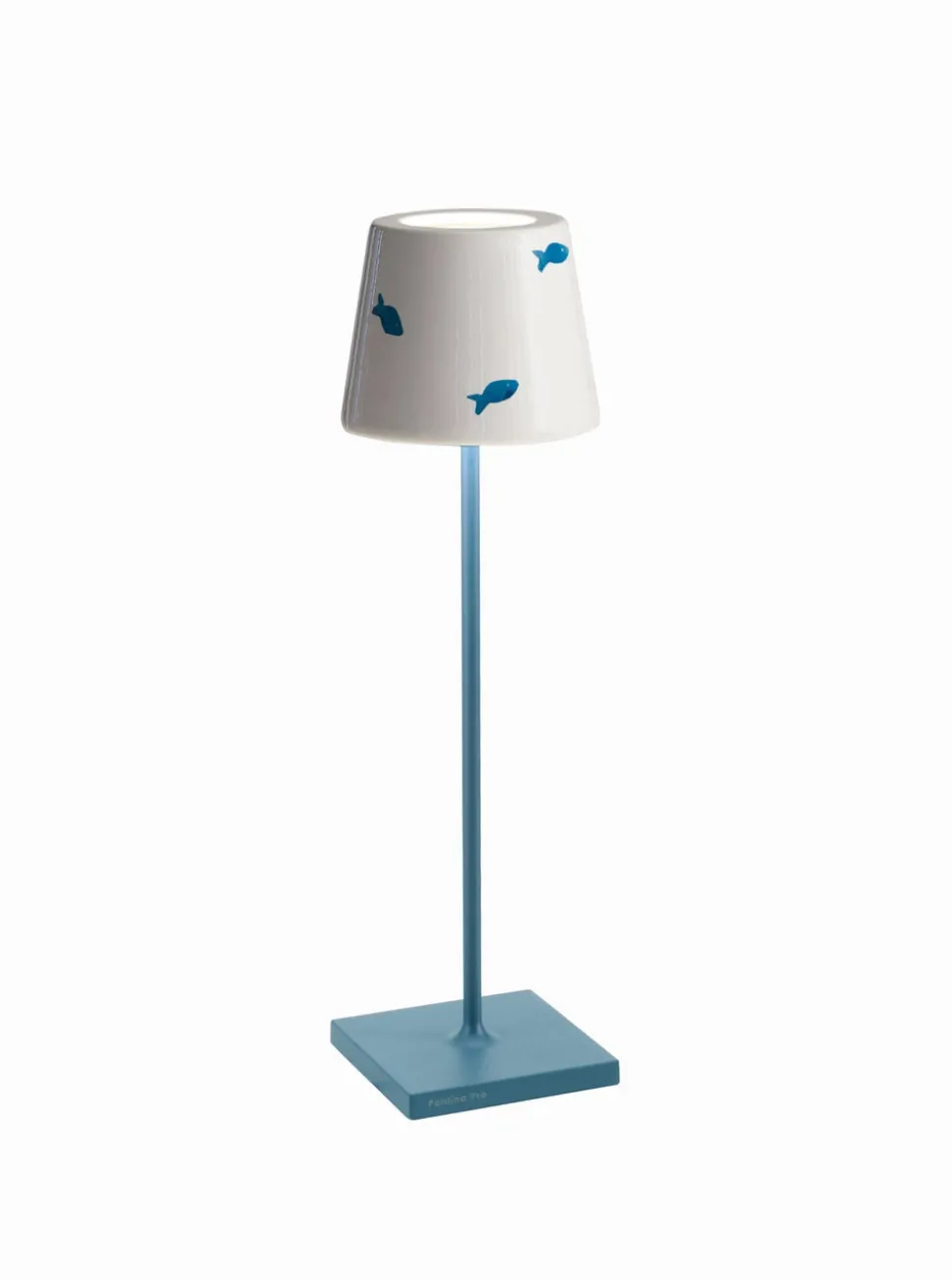 Zafferano lamps and glassware harness centuries of Murano craftsmanship, and hone it through the inimitable vision of Federico de Majo, giving these delicate, finely made pieces modern touches and endlessly stylish flair. Made of smoothed metal, and fully rechargeable, the Poldina Lido in Light Blue Fish is both lightweight and portable. The sturdy, square base and coated protection allows for indoor and outdoor use, and the playful fish pattern on the shade is irresistible. The best part, its dimmable function allows you to have only the most tasteful layer of light you require.