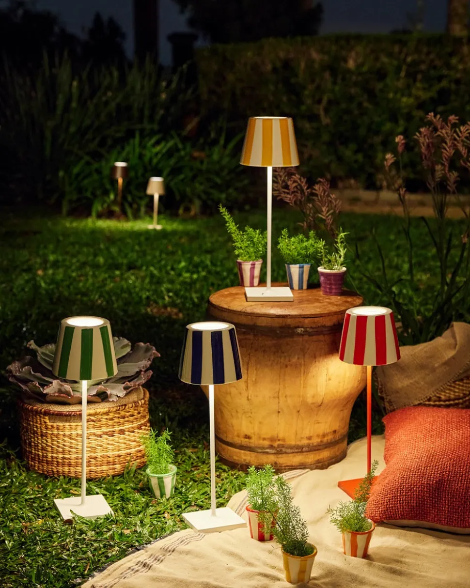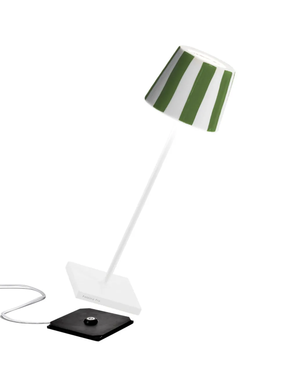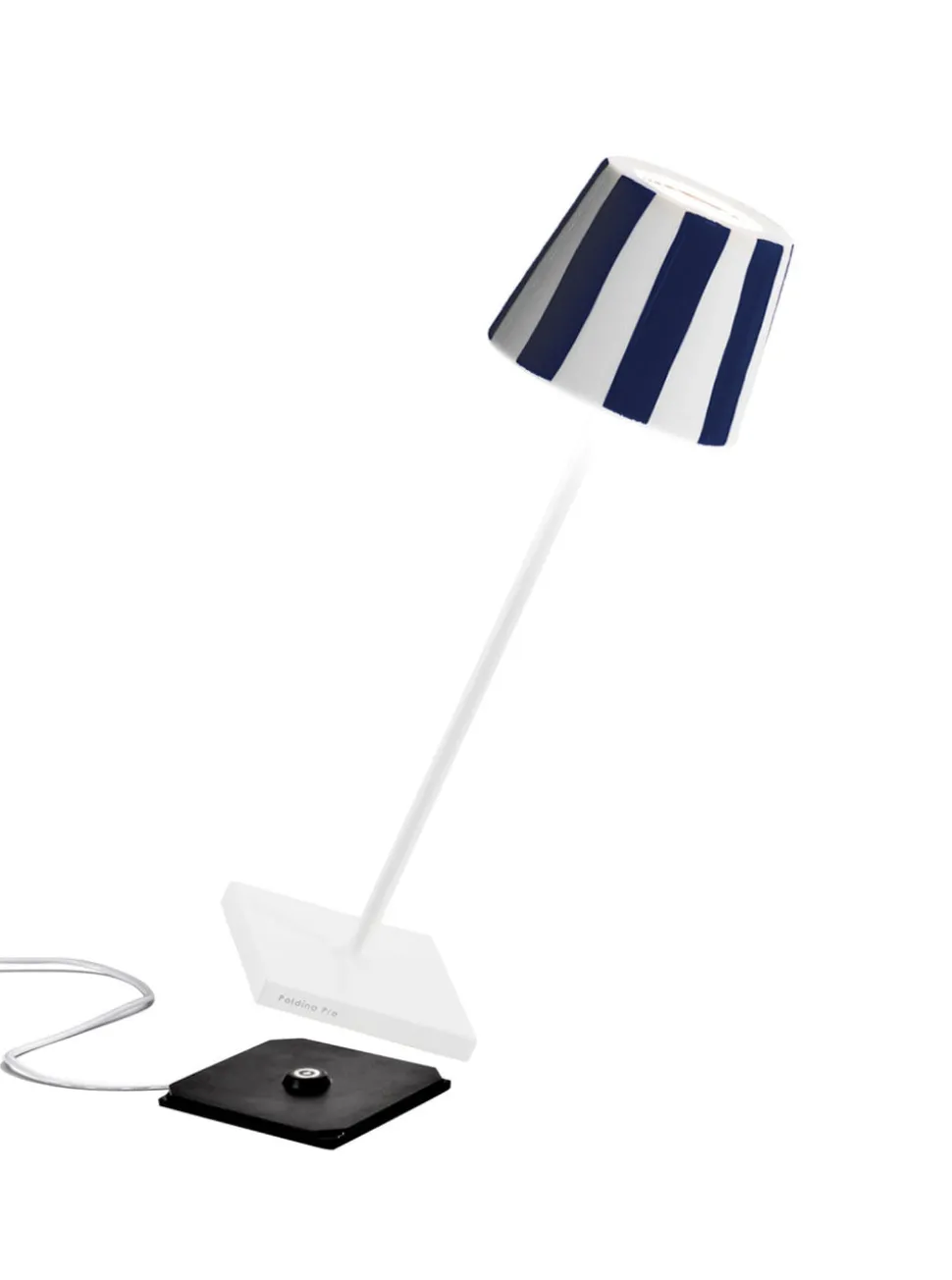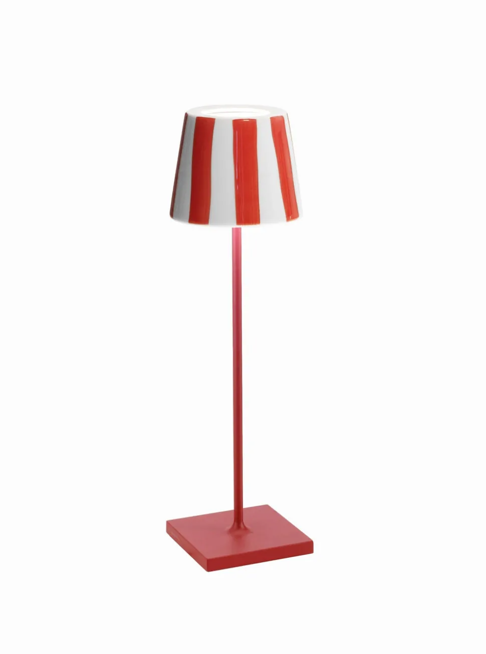 Zafferano lamps and glassware harness centuries of Murano craftsmanship, and hone it through the inimitable vision of Federico de Majo, giving these delicate, finely made pieces modern touches and endlessly stylish flair. Made of smoothed metal, and fully rechargeable, the Poldina Lido in Stripe is both lightweight and portable. The sturdy, square base and coated protection allows for indoor and outdoor use, and the playful stripe pattern on the shade is irresistible. The best part, its dimmable function allows you to have only the most tasteful layer of light you require.