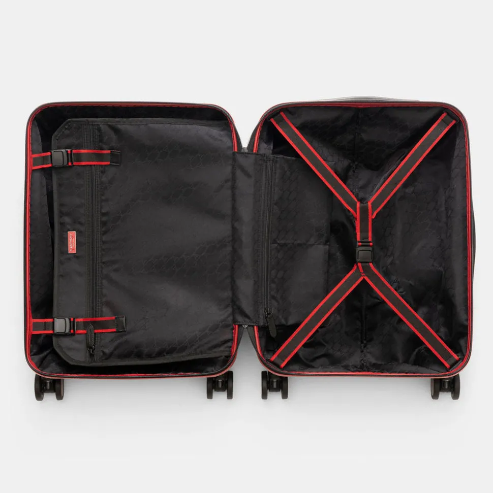 Straps and a divider for organized packing. Multiple pockets for managing belongings during travel. Four-wheel design takes the stress off your arm and shoulder and increases maneuverability. Built-in TSA approved combination lock. Personalized with your monogram.