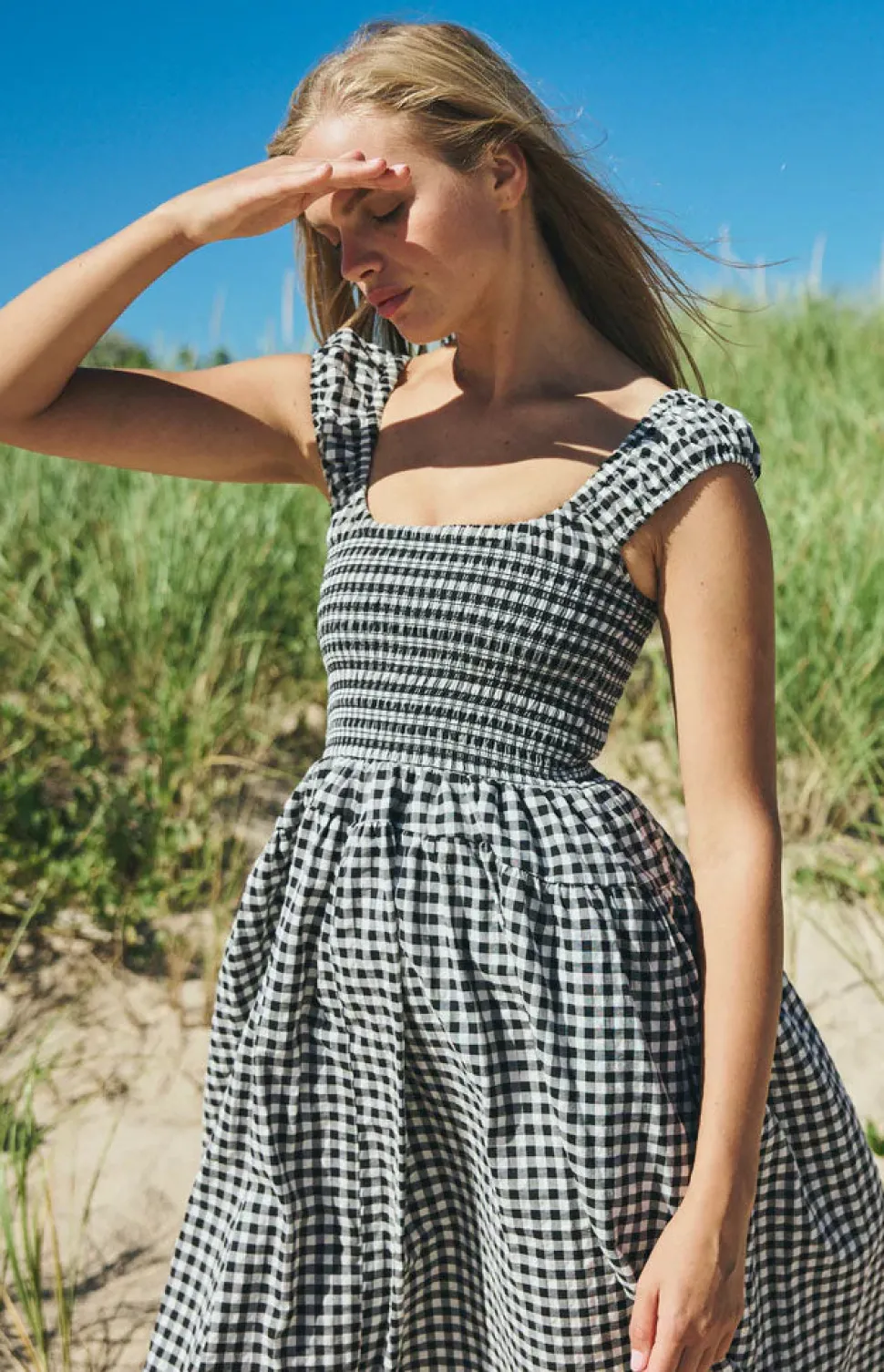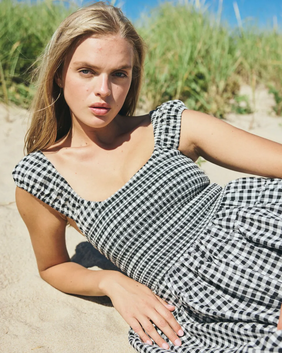 Louise New York creates its collection with the past and present in mind. Inspired by timeless glamour instead of trends, when you slip into a Louise New York dress, you carry all the confidence and carefree attitude that femininity can acclaim. Light, airy, and effortlessly romantic. Easy, flattering, and endlessly wearable. The Poppy Dress in Black Gingham features a smocked bodice, wide ruched straps, and a full skirt in classic black and white gingham.