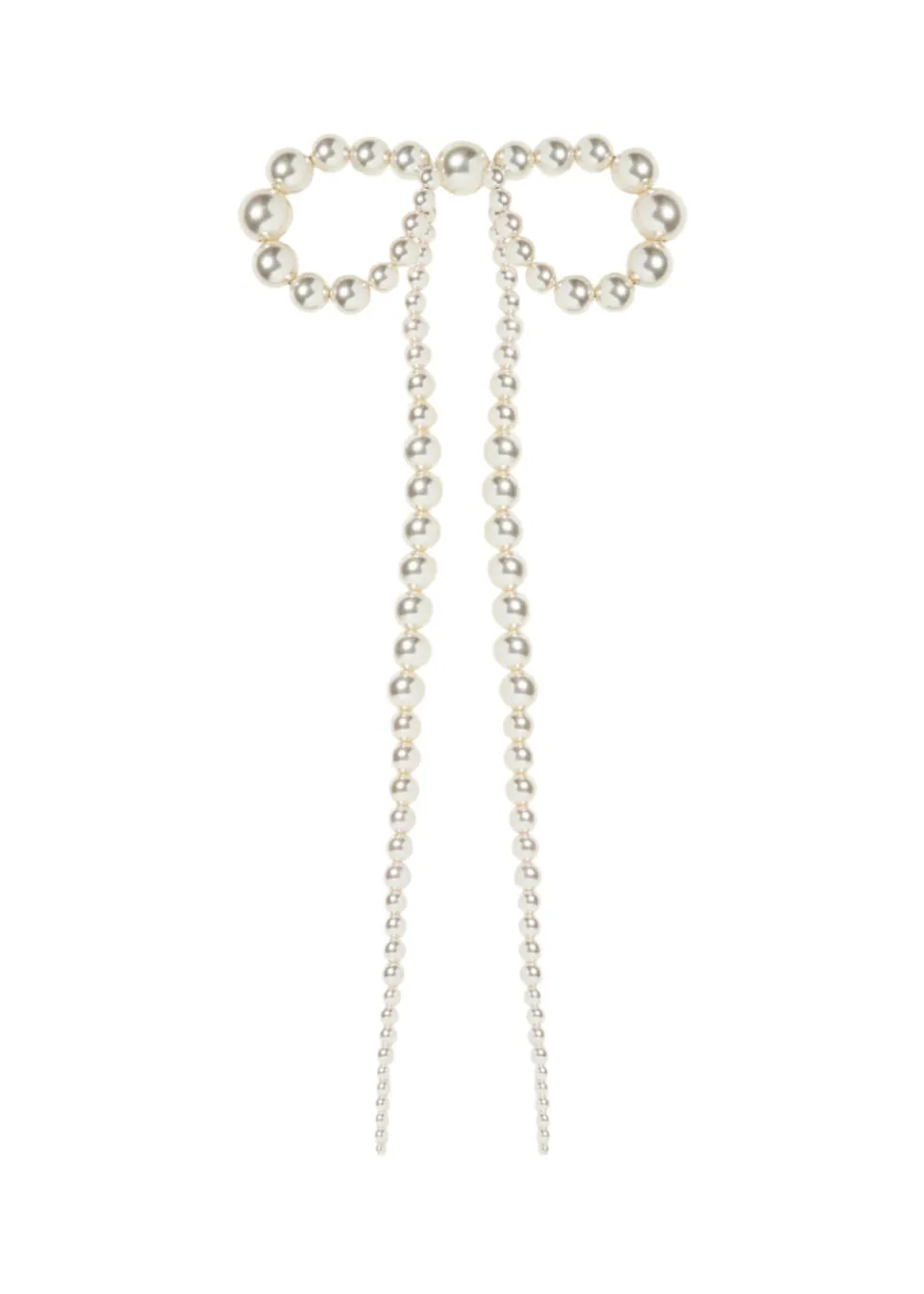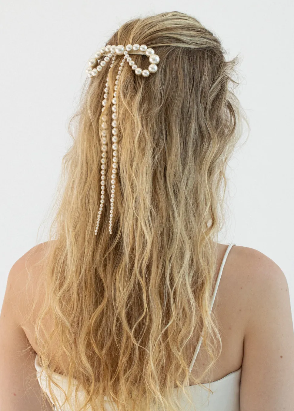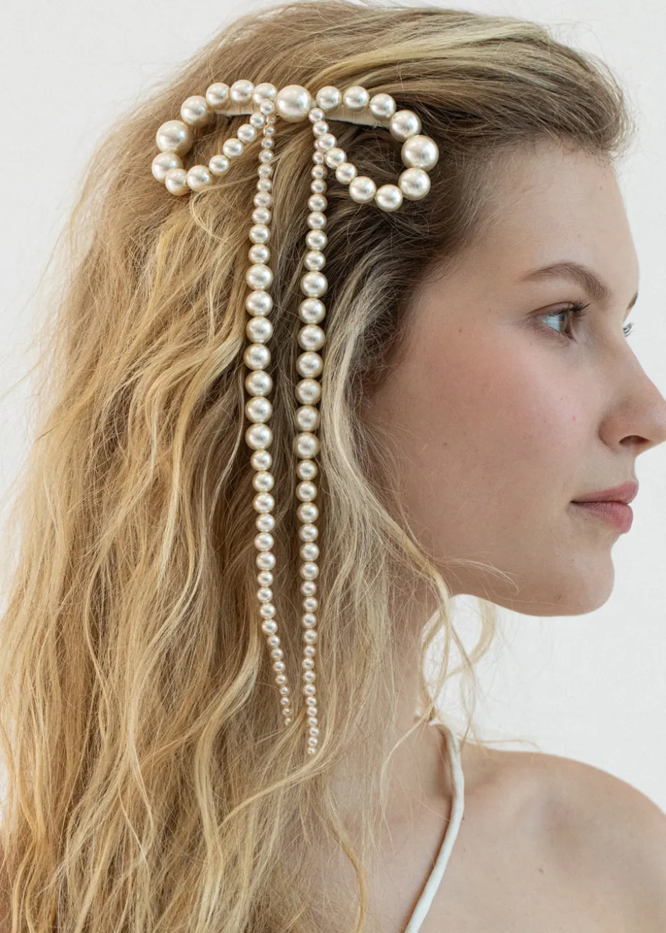 “Everything has a story to tell,” says Jennifer Behr, the founder of her namesake luxury hair accessory brand that has blossomed into one of New York City’s foremost ateliers for jewelry, as well as bridal. In every crystal, pearl, and ribbon, you’ll find the utmost quality and a sense of romance, as each piece reveals a modern interpretation of centuries-old regalia. The Presley Bow Barrette finishes a look with a uniquely dramatic perspective. An outfit-defining finisher, each pearl is strung by hand, fluctuating in size to create the sublime illusion of a bow quite literally dripping with pearls. Though this bow makes a statement like a prized jewel, it sits on an automatic French barrette clasp for easy placement in any hairstyle