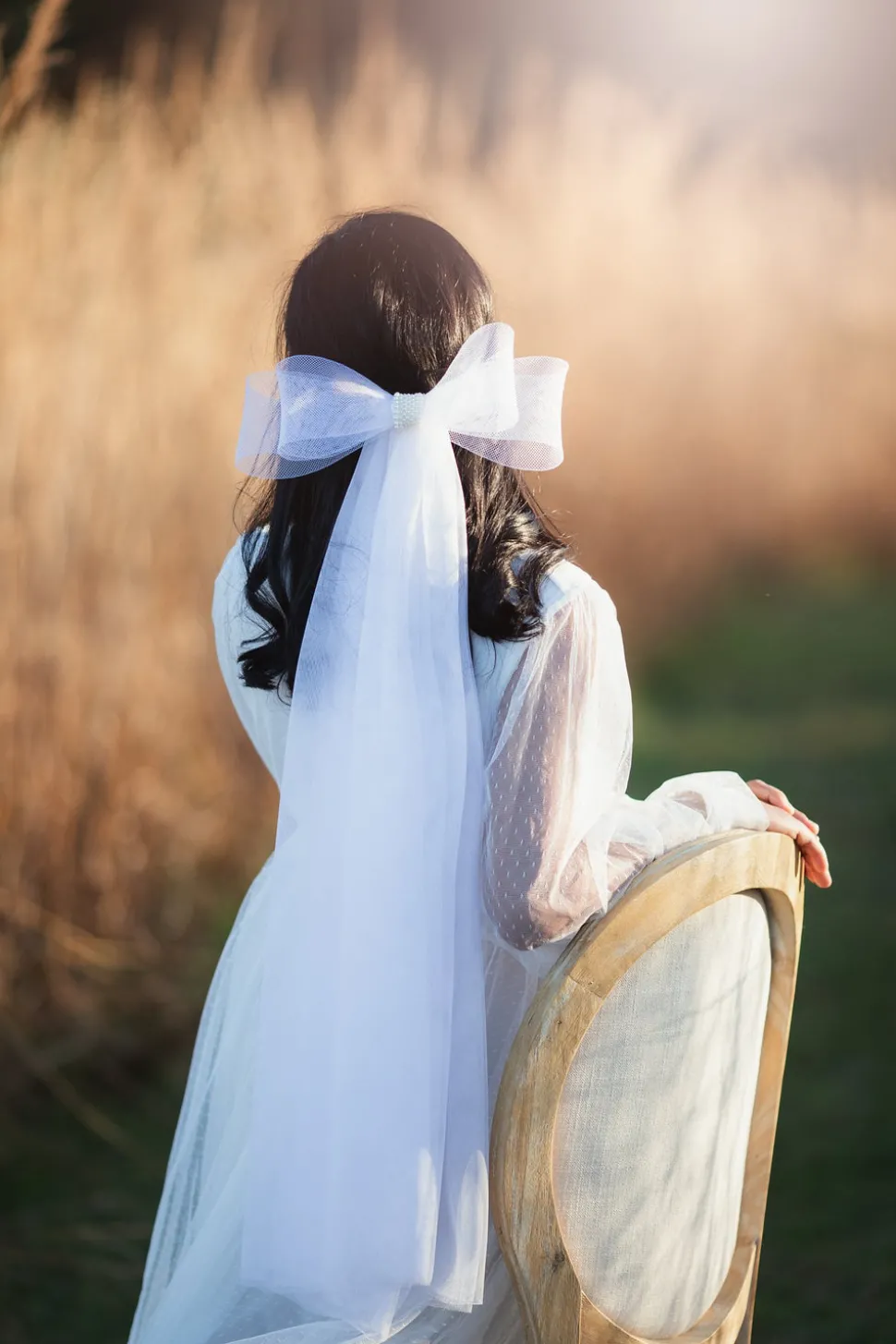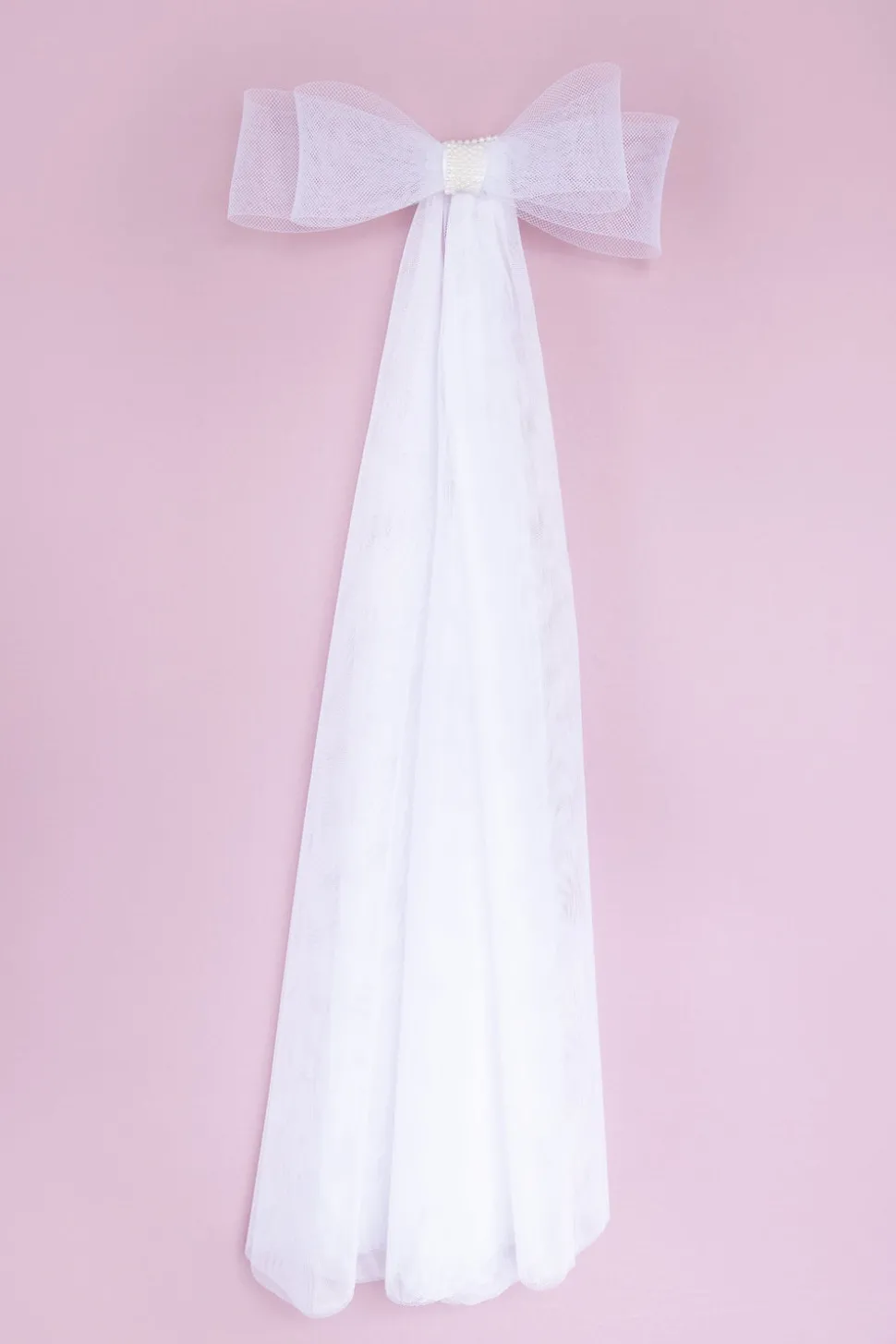 White crinoline bow, wrapped in 100% silk fabric and ivory pearls and attached to English tulle veiling with a silver metal comb.