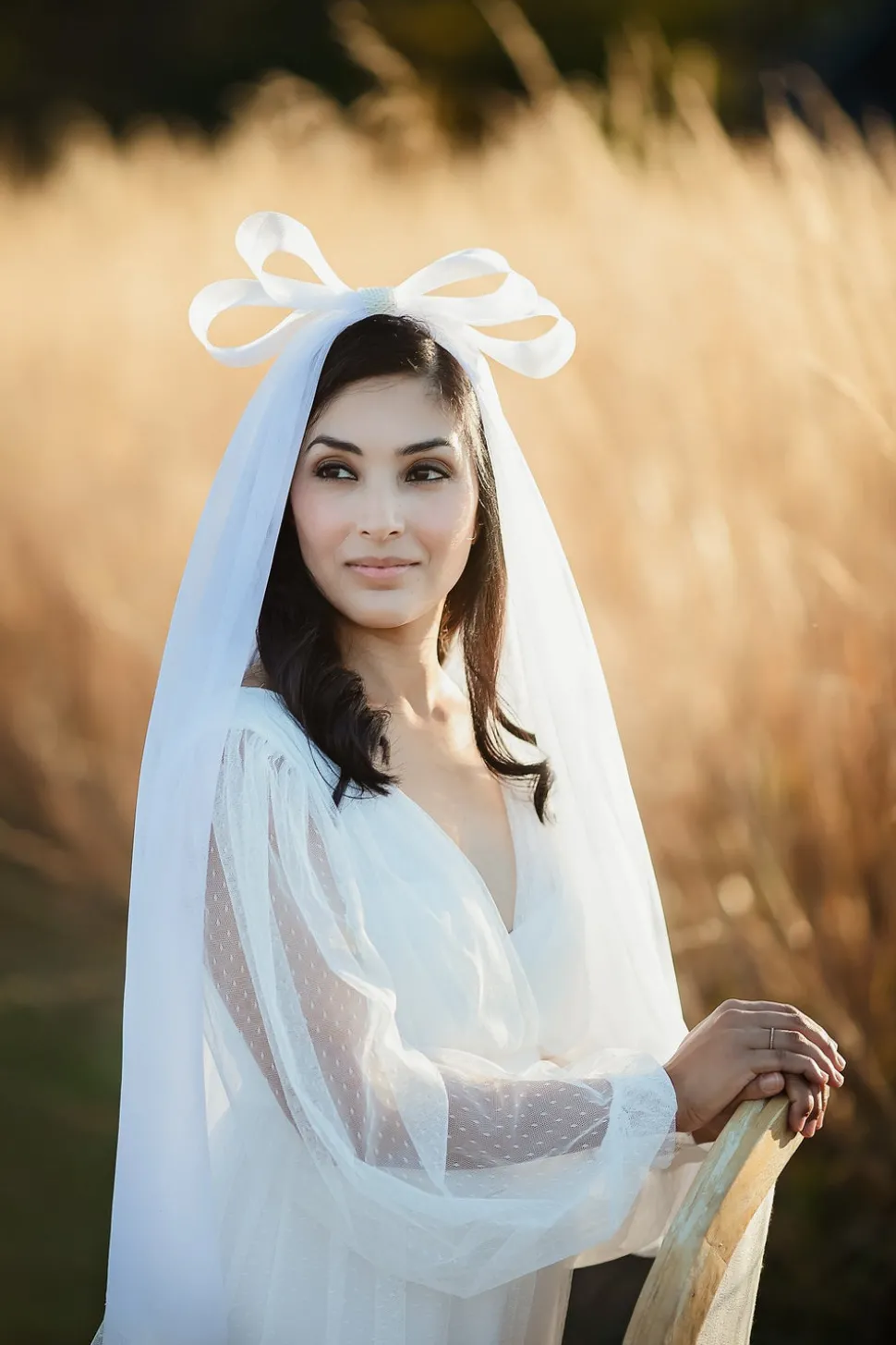Based in New Jersey, Sara Brosious handcrafts luxurious accessories for the modern yet timeless bride. The Priscilla Bow Veil is a chic addition to any wedding outfit. Embellished with ivory pearls and silk, the English Net veiling is secured with a silver hair comb.