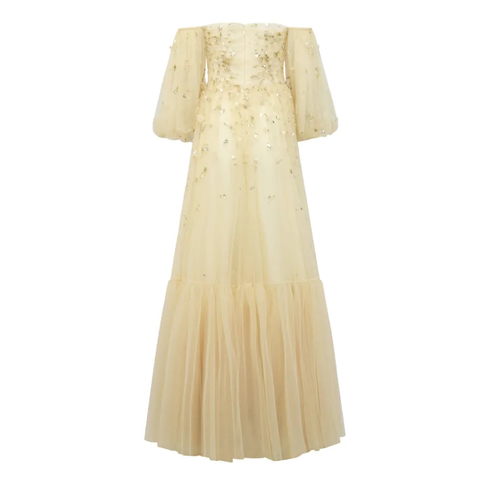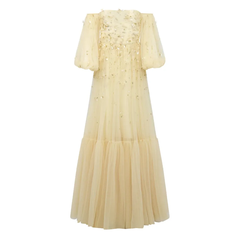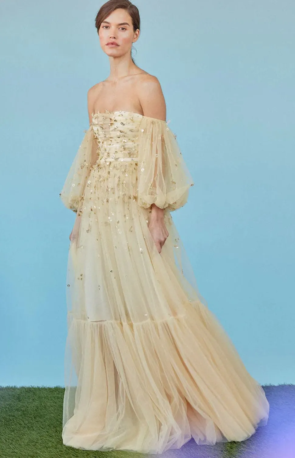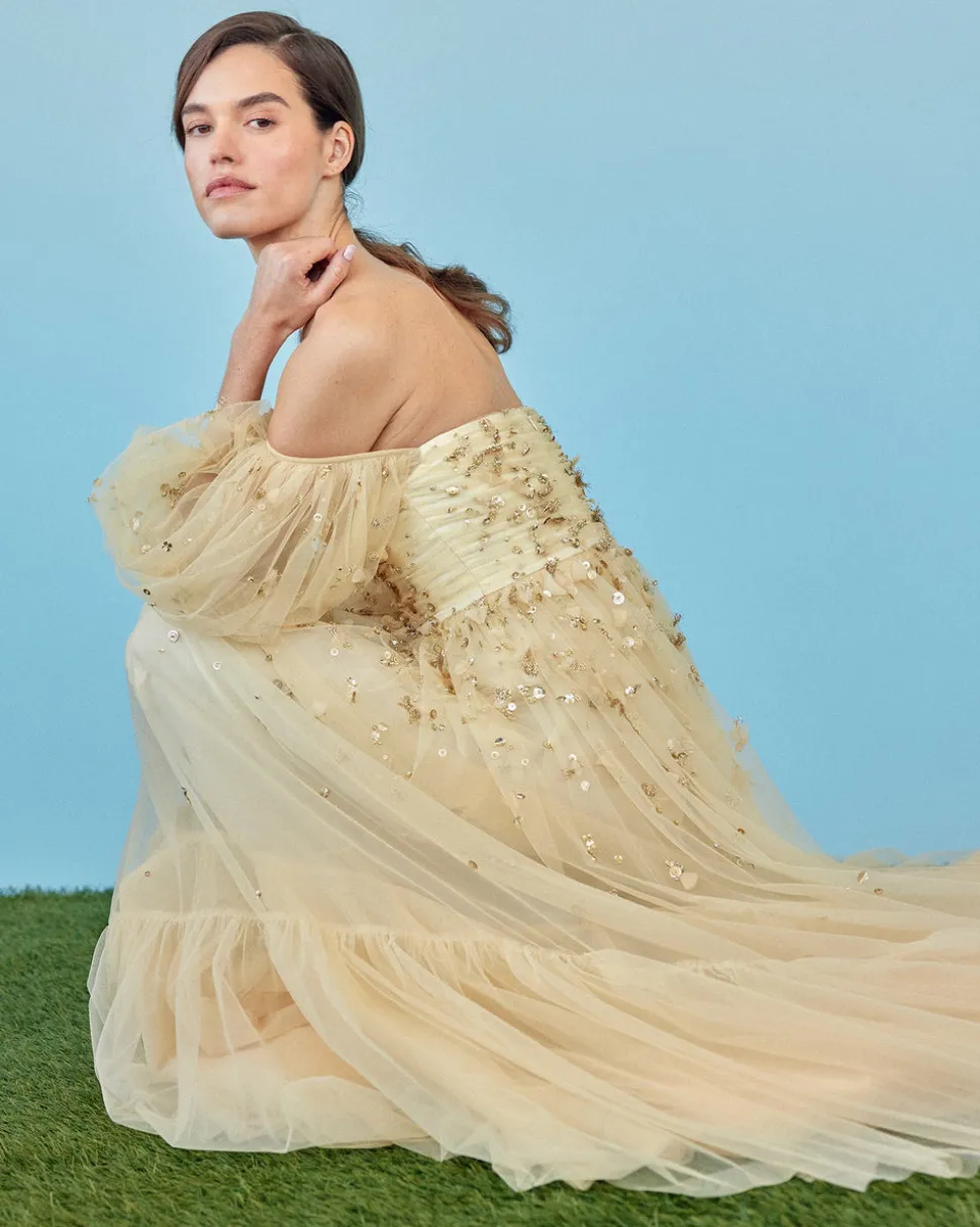 A graduate of the Savannah College of Design, award-winning Alexandra Pijut’s namesake line arrives from her studio in New York, offering luxe ready-to-wear pieces that distinguish themselves between femininity and practicality. The brand’s spring collection, “Picnic in Jaipur,” is inspired by the vibrant, maximalist colors and patterns of Villa Palladio. Crafted in layers of voluminous tulle, the Priyanka Gown in Gold Tulle with Sporadic Sequins is adorned with whimsical embellishments of paillettes, fabric fans, and crystals. Featuring an interior corset for structure, it’s cut in a is strapless style, with a sheer panel in the bodice and off the shoulder sleeves for unmatched elegance and a touch of romance.