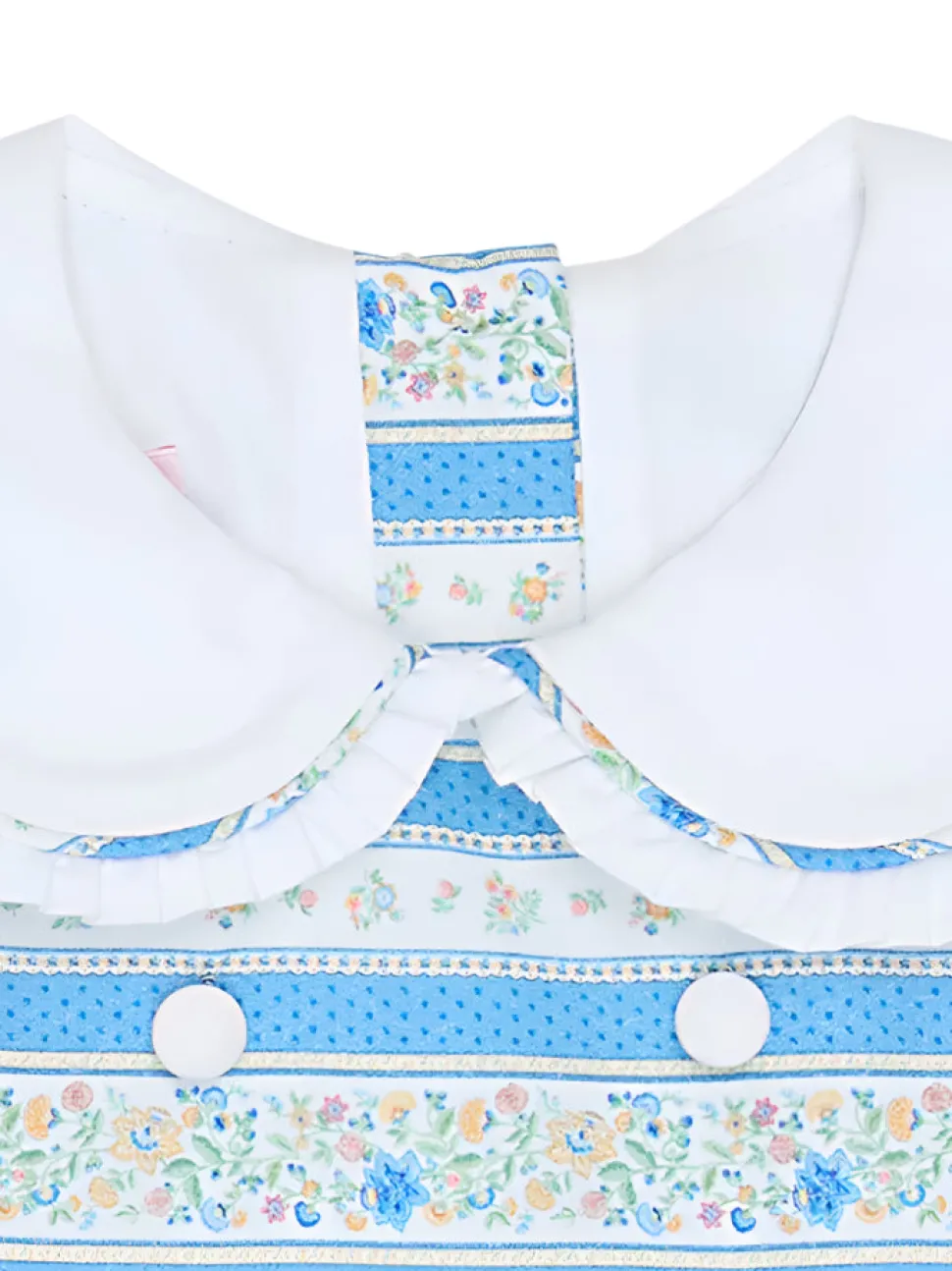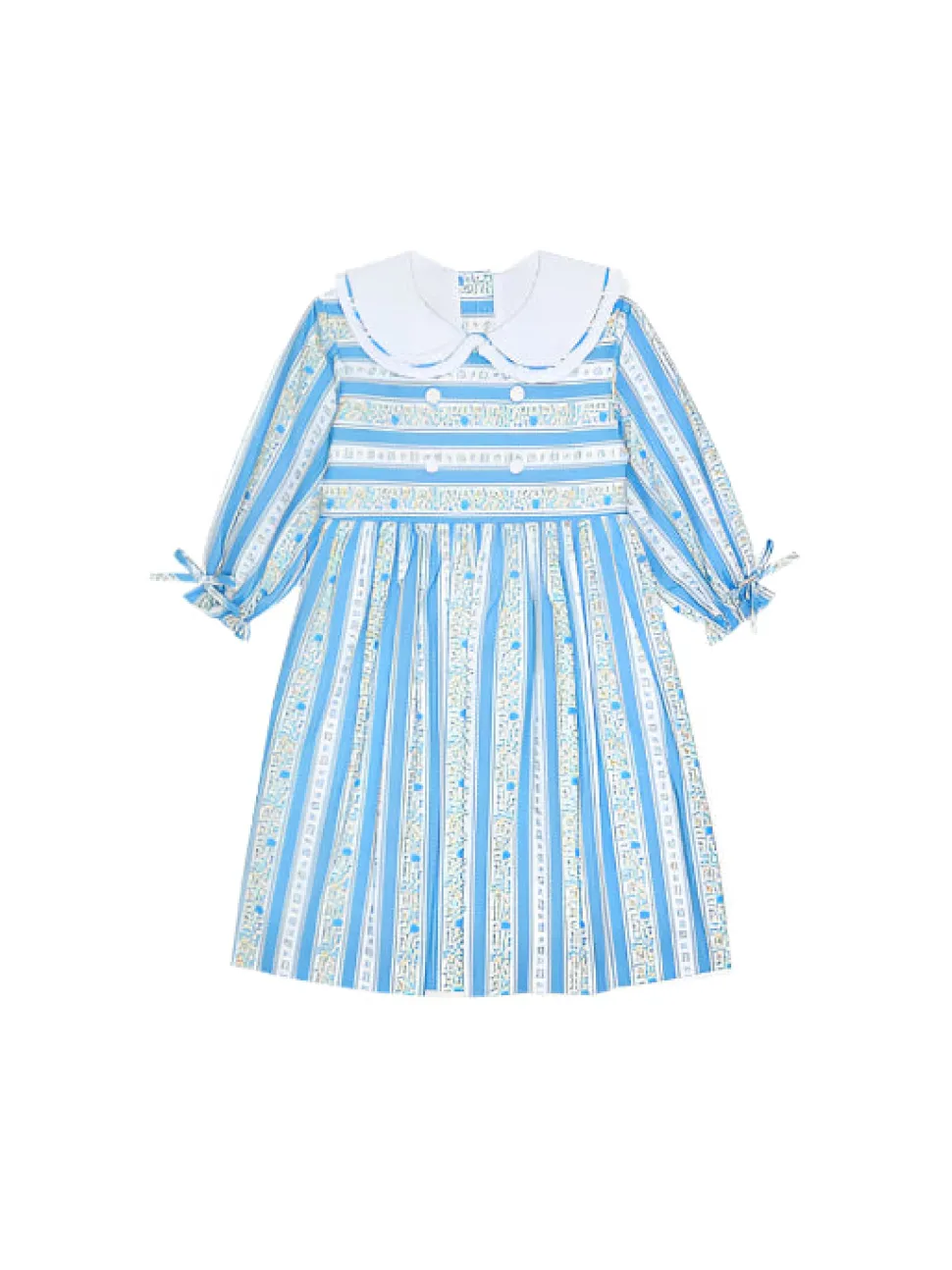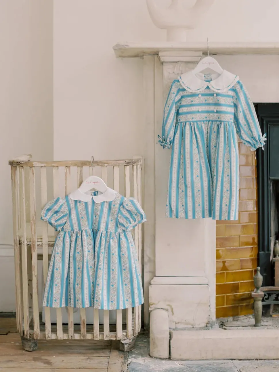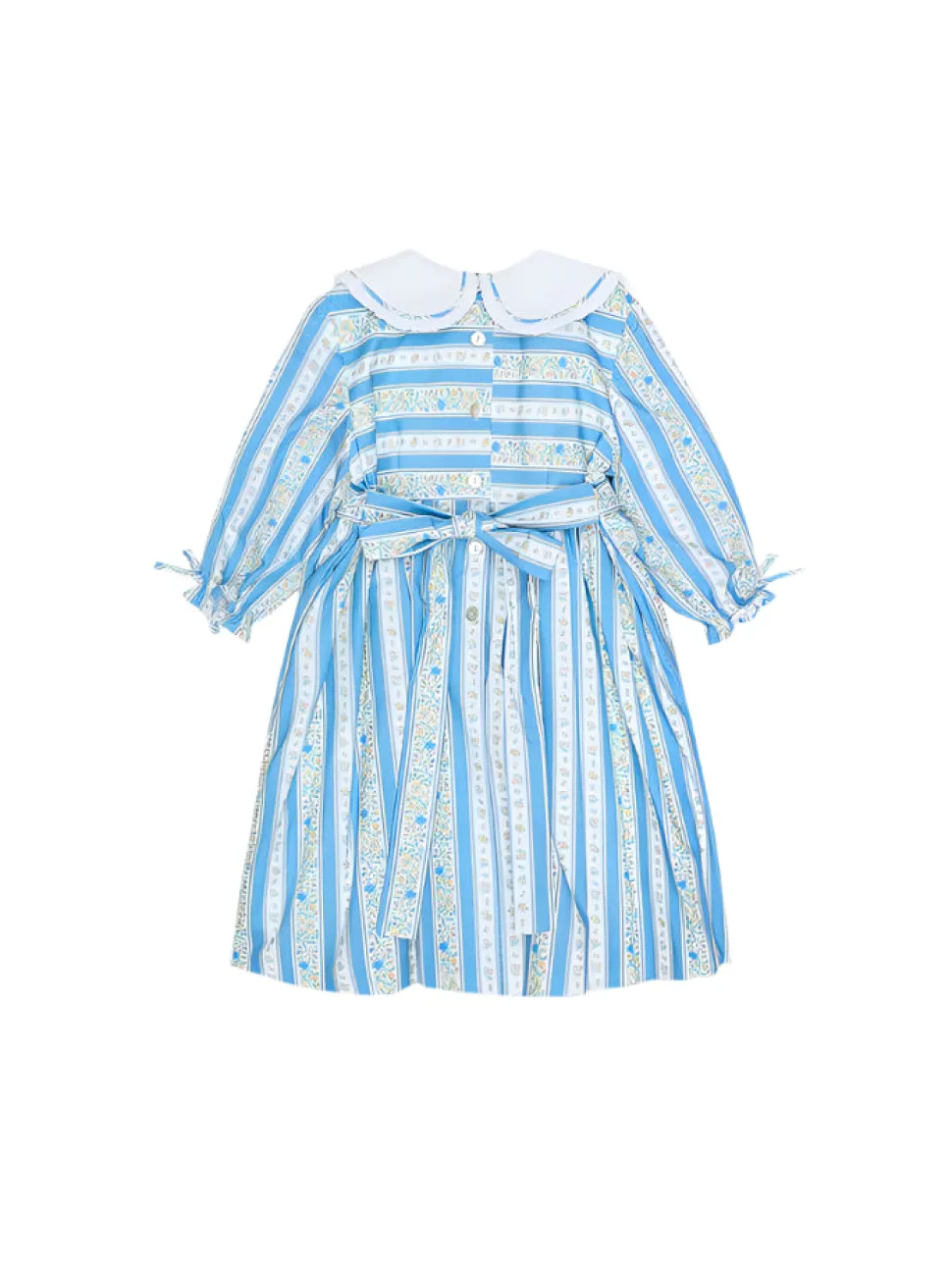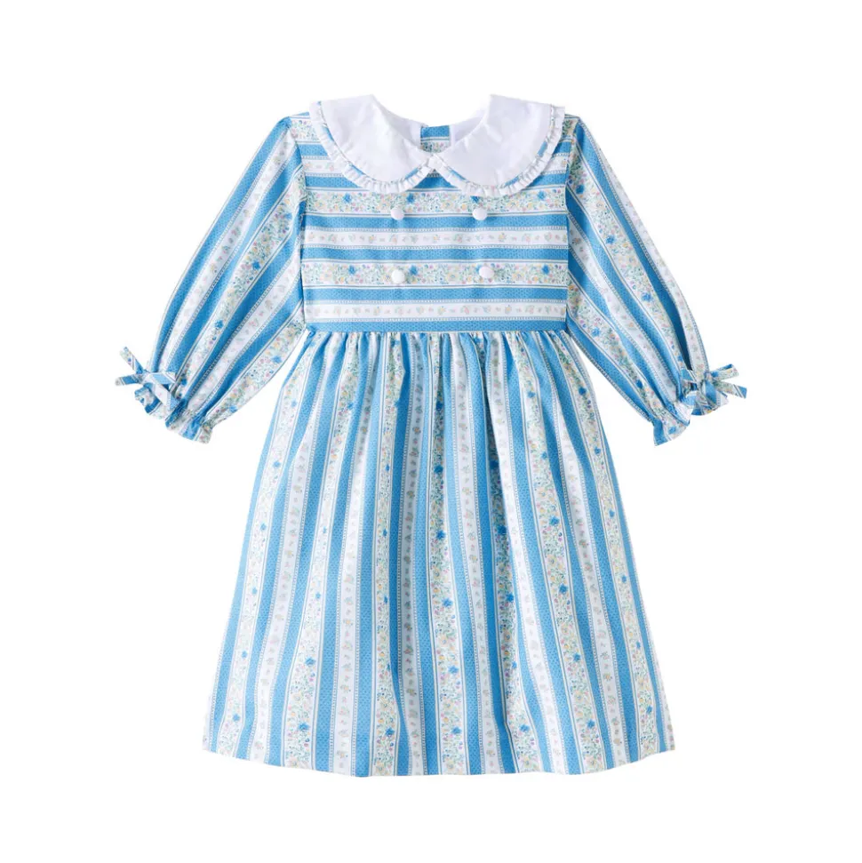 La Coqueta’s Provenza Girl Dress brings vintage-inspired charm to elevated seasonal dressing. Its fit-and-flare design features three-quarter sleeves finished with delicate self-tie bows, a cotton-lined skirt for comfort, and a mother of pearl button placket at the back to fasten. Inspired by vintage botanical illustrations, delicate floral motifs and stripes were first hand-rendered in fine detail before being digitally refined and printed in Spain in small runs of fabric. The result is a soft, painterly pattern in dusty blue hues, perfectly complementing the feminine details. Crafted from luxuriously soft pure cotton, finishing touches include a statement Peter Pan collar traced with a pleated trim, white covered buttons, contrasting piping, and a self-tie bow at the back for added elegance—a true reflection of La Coqueta’s signature style.