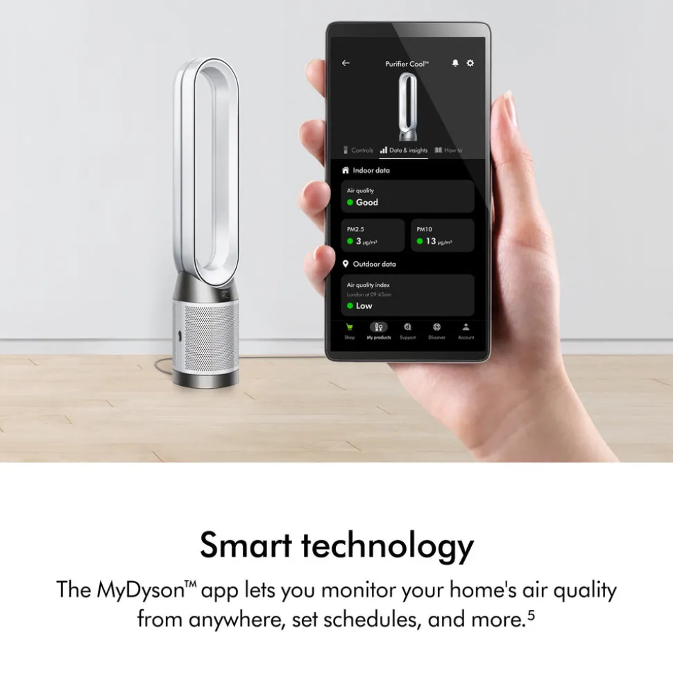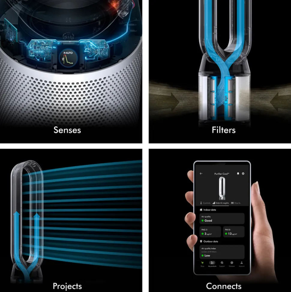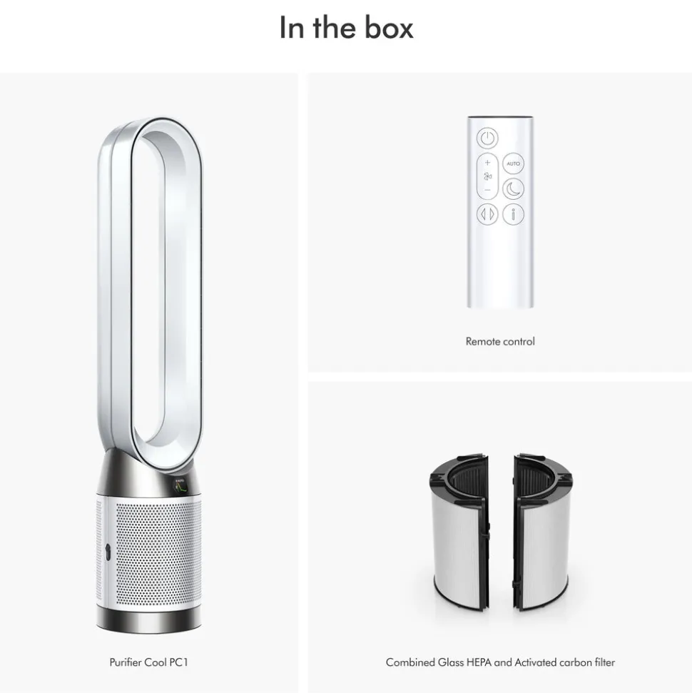 Founded in 1991 by James Dyson in England, the Dyson brand designs and manufactures household appliances—engineering solutions to everyday problems, from capturing dirt and air pollution to reducing hair damage. Each Dyson product is innovated to set new standards, spanning whole-home cleaning, healthier hair styling, and more. The Purifier Cool PC1 in White delivers powerful purification with a fully sealed HEPA H13-grade filtration system that captures 99.97% of microscopic allergens and pollutants—ensuring what goes inside stays inside. Activated carbon removes gases, while Dyson Air Multiplier™ technology projects purified air across the room with smooth oscillation up to 350°.