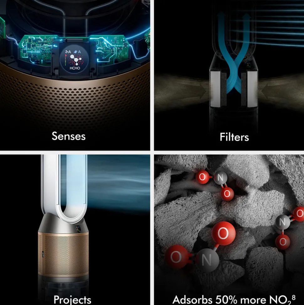 Founded in 1991 by James Dyson in England, the Dyson brand designs and manufactures household appliances—engineering solutions to everyday problems, from capturing dirt and air pollution to reducing hair damage. Each Dyson product is innovated to set new standards, spanning whole-home cleaning, healthier hair styling, and more. The Purifier Humidify + Cool De-Nox PH2 in White & Gold combines advanced air purification, humidification, and cooling in one sleek, high-performance machine. It automatically captures 50% more nitrogen dioxide (NO₂), removes 99.9% of bacteria from water, and uses a fully sealed 3-stage HEPA H13-grade filtration system to remove particles, odors, and gases while continuously destroying formaldehyde in spaces. The MyDyson app allows remote control and real-time air quality monitoring.