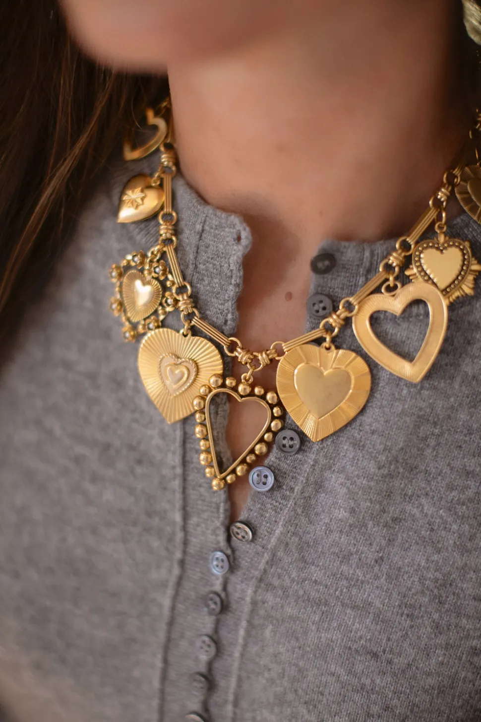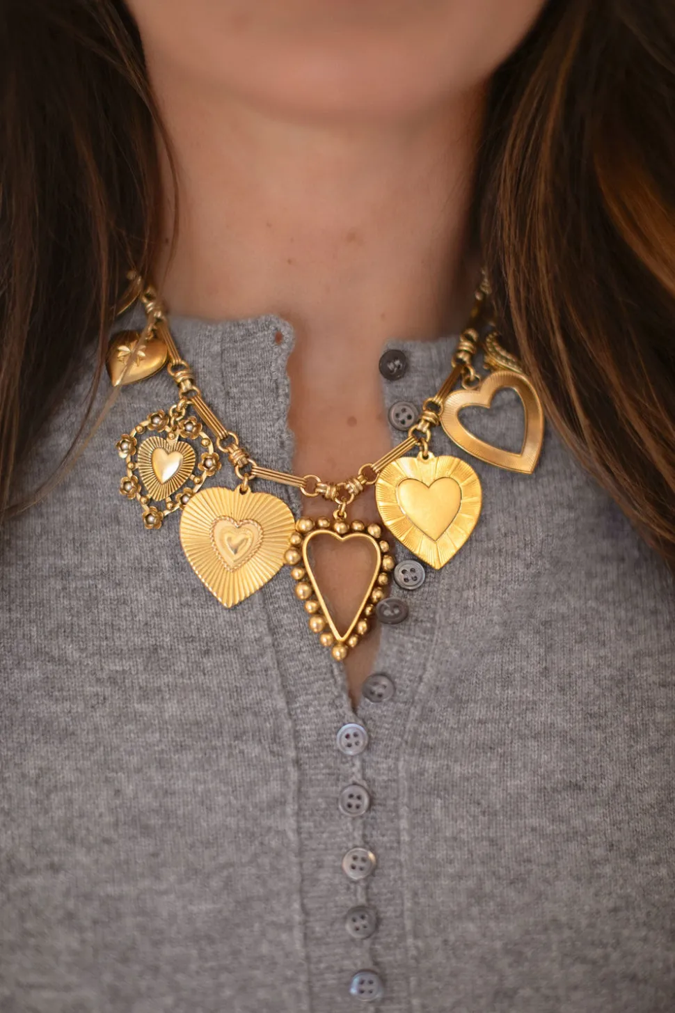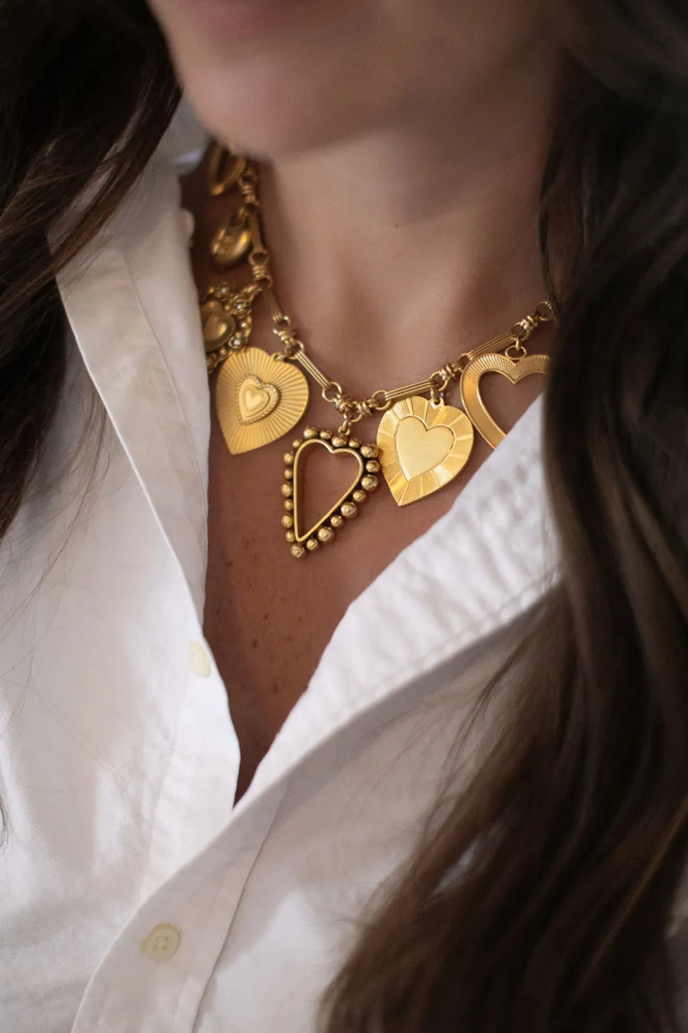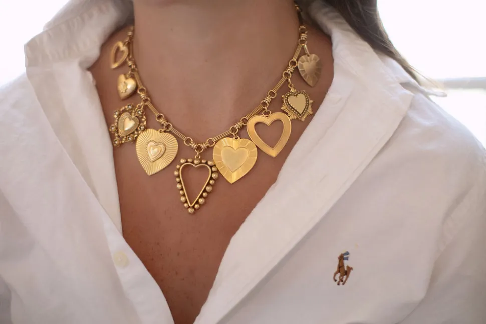 The mother-daughter duo behind Brinker + Eliza combine their experience in metalsmithing and fashion to create incredibly unique jewelry that feels custom-made. Employing pearls, shells, and earth’s most prized organic forms, these are pieces to be not just worn but treasured. The Queen of Hearts Necklace is trimmed with a variety of 24-karat antique gold-plated brass heart pendants and charms.