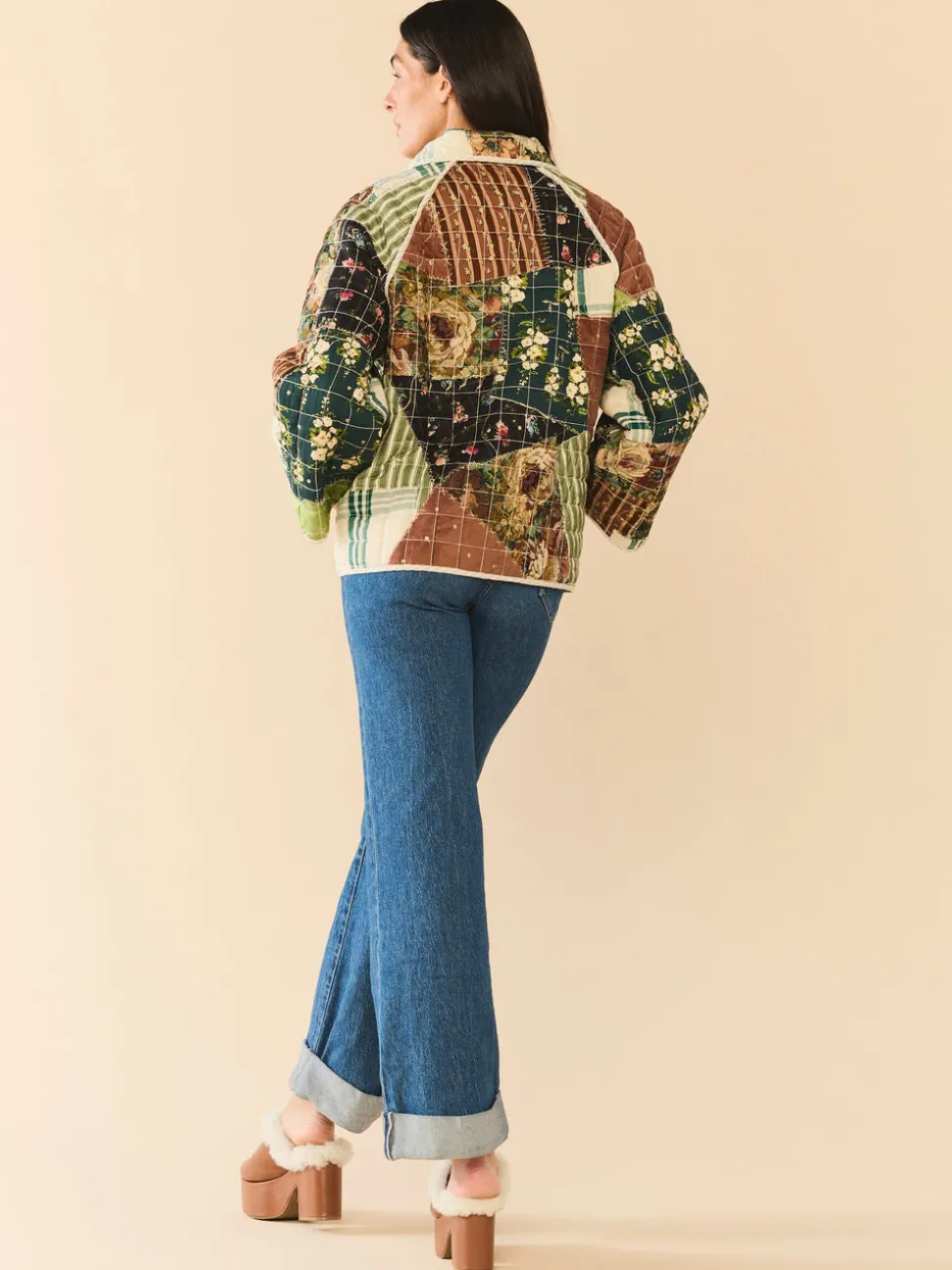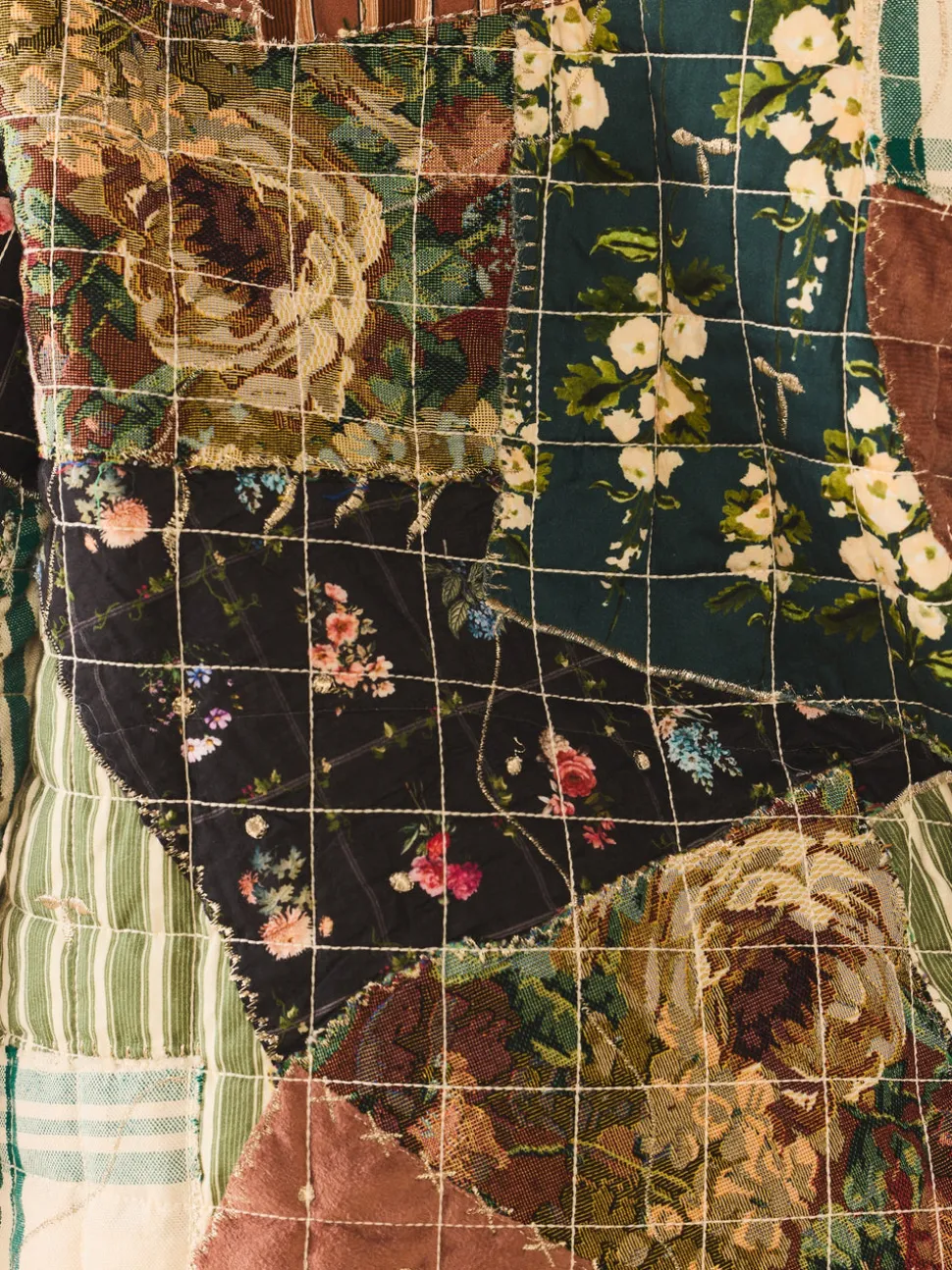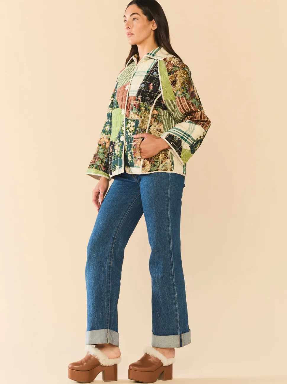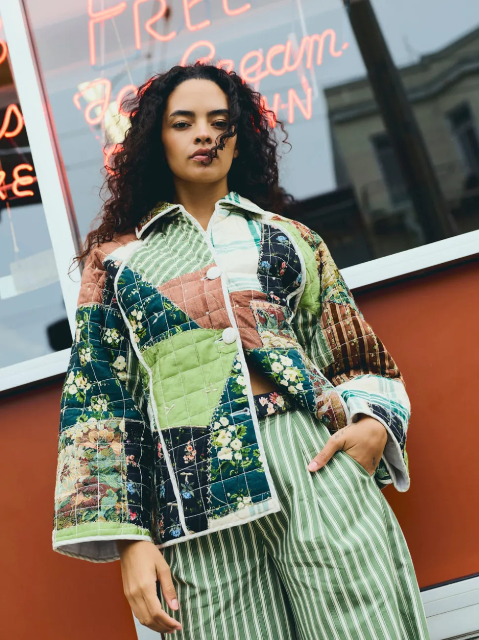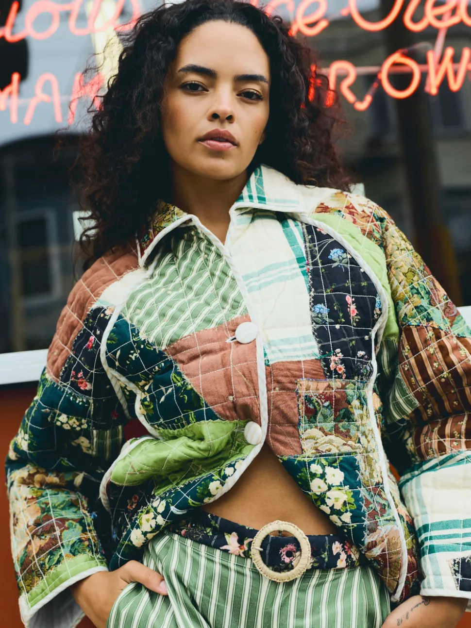 Tomboy looks, girly-girl styles, and an always fashionable approach define EDDY’s aesthetic. With a focus on bold and feminine silhouettes, EDDY dresses and tops pair elevated California bohemian with global inspiration; these are clothes designed to make you feel good inside and out. The Quilted Scrap Jacket is a one-of-a-kind creation stitched from EDDY history. Crafted entirely from leftover fabrics of the Fall 2025 collection, each patch tells a story—from a floral dress to a classic plaid—quilted together into something timeless and full of soul. Designed with a boxy fit, oversized buttons, and a soft, cozy weight, it’s a testament to craftsmanship, creativity, and conscious design.