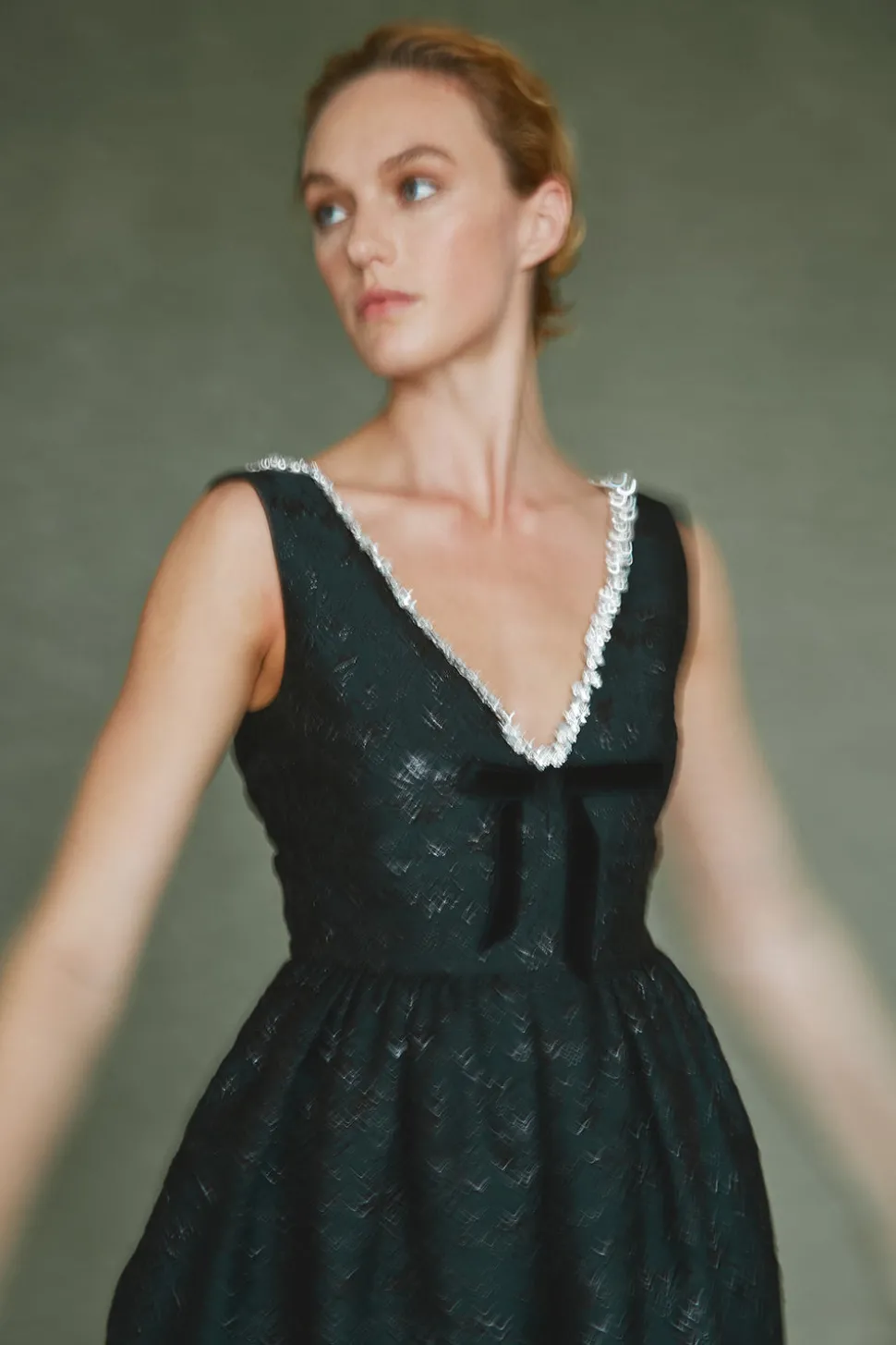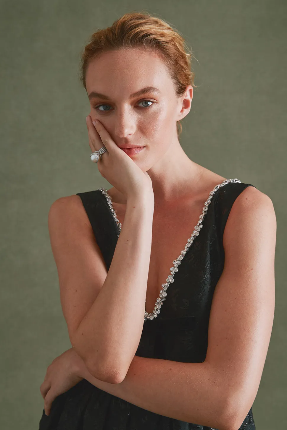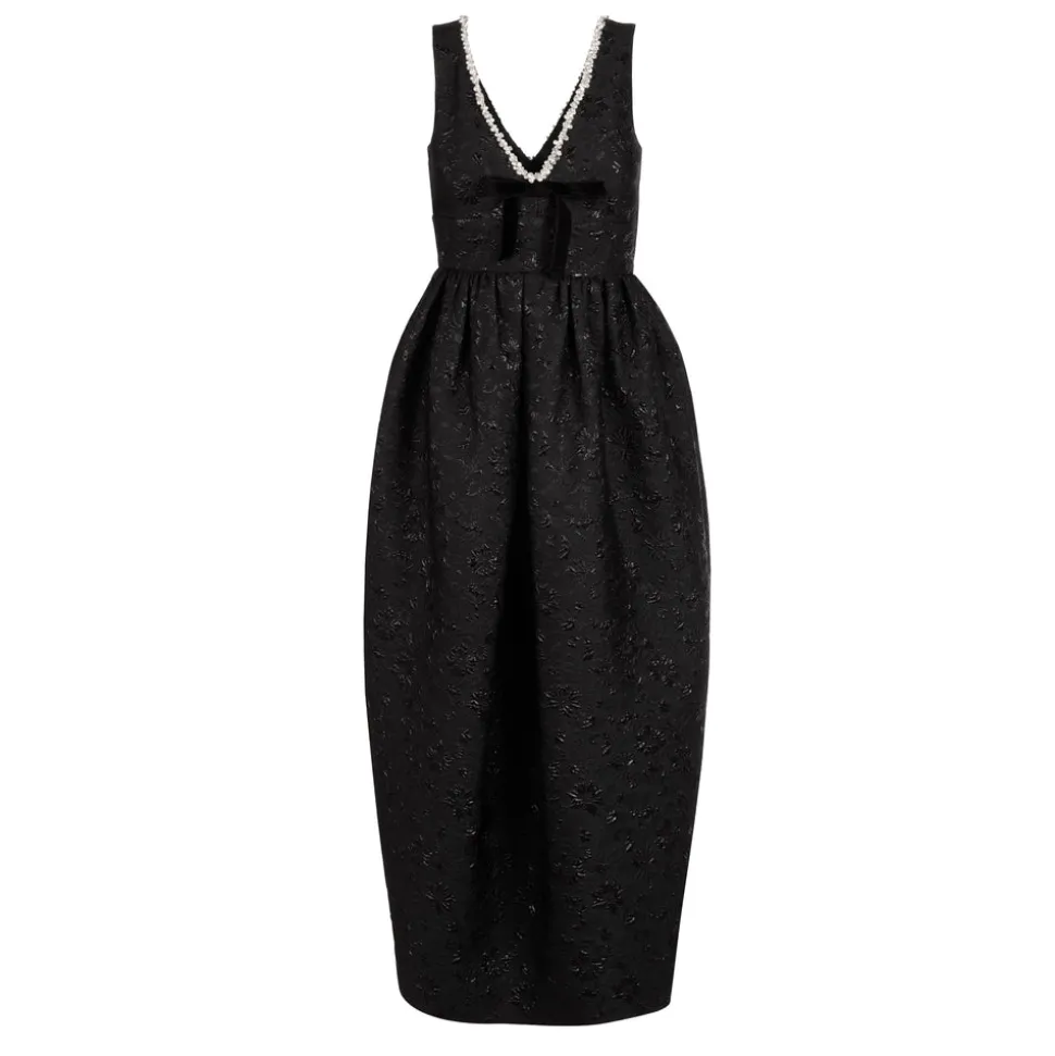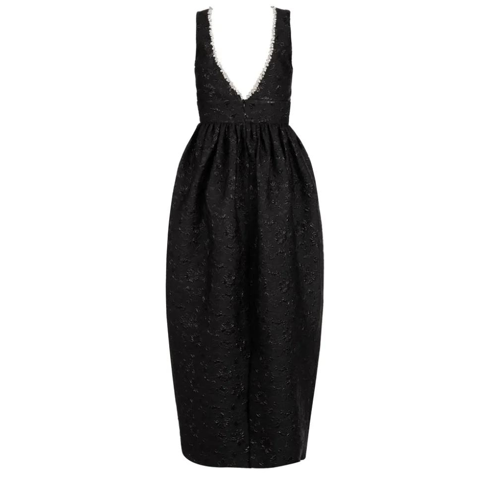 A graduate of the Savannah College of Design, award-winning Alexandra Pijut’s namesake line arrives from her studio in New York, offering luxe ready-to-wear pieces that distinguish themselves between femininity and practicality. Incorporating elements of the designer’s childhood, like equestrian tailoring and dancewear, the Rainey Dress in Black Floral Brocade boasts a deep V-neckline, adorned with crystal trim and a velvet bow. Where we fall in love is with the puffed, tapered skirt, a nod to ballet tutus, in a decadently brocaded floral pattern.