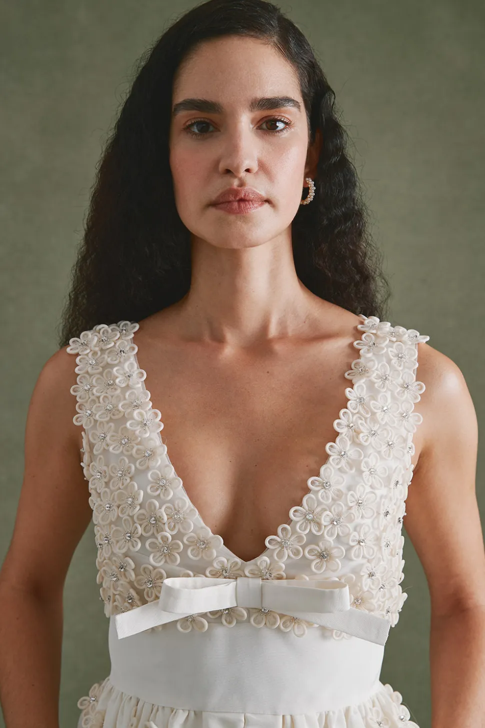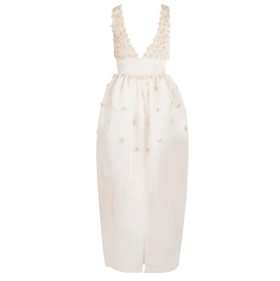 A graduate of the Savannah College of Design, award-winning Alexandra Pijut’s namesake line arrives from her studio in New York, offering luxe ready-to-wear pieces that distinguish themselves between femininity and practicality. Incorporating elements of the designer’s childhood, like equestrian tailoring and dancewear, the Rainey Dress with Floral Appliqué boasts a deep V-neckline, adorned with beaded, organza flower appliqués. Where we fall in love is with the puffed, tapered skirt, a nod to ballet tutus. This can be a wedding look or a party dress—it works beautifully for both.