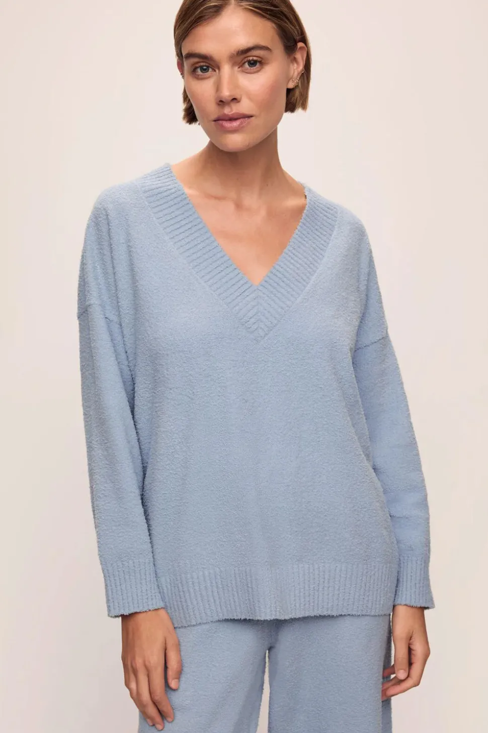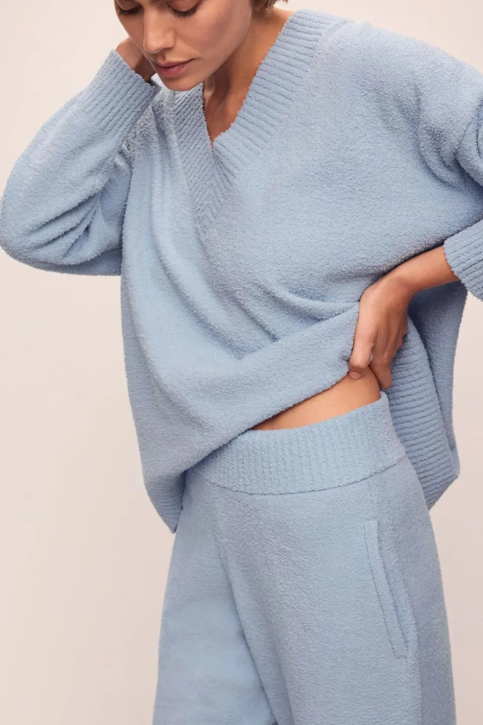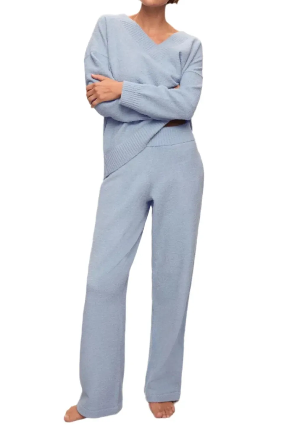In 1996, Eberjey co-founders Ali and Mariela understood the visceral desire for beautiful, functional sleepwear that supported sleep and individual style. At last, pajamas can be sensual, comfortable, tailored, and effortless. The Recycled Boucle Pant in Wedgewood Blue feels like the coziest hug and is perfect for cold winter nights. The high-rise, wide-leg sweater pant features a ribbed elastic waistband, side seam pockets, and a relaxed fit for a modern look with a comfortable feel.