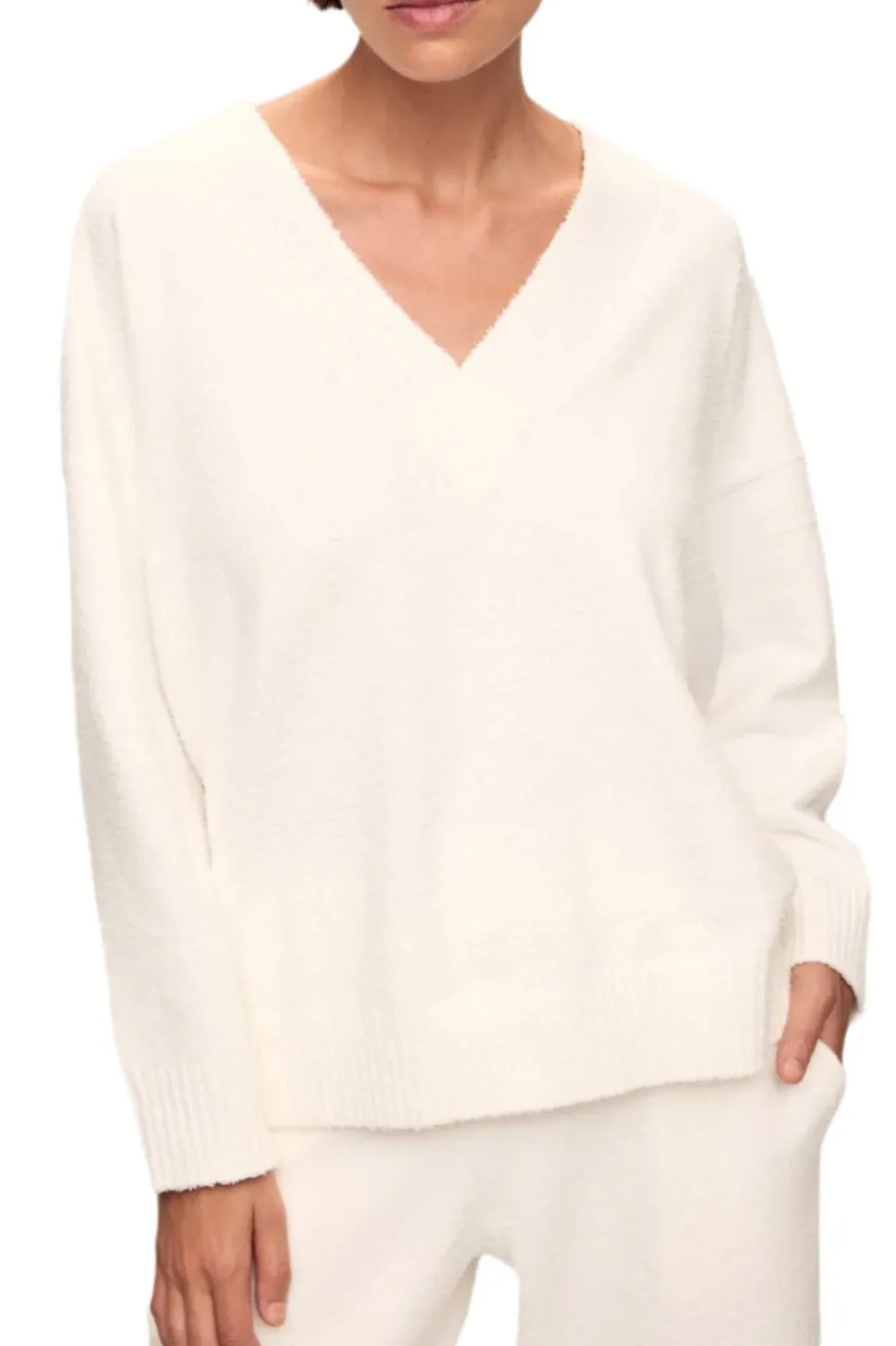 In 1996, Eberjey co-founders Ali and Mariela understood the visceral desire for beautiful, functional sleepwear that supported sleep and individual style. At last, pajamas can be sensual, comfortable, tailored, and effortless. The Recycled Boucle V Neck Sweater in Ivory adds a touch of feminine sophistication, while the wide ribbed trim detail at the neckline, cuffs, and hem provides a modern finishing touch. Crafted from 100% post-consumer polyester, this sweater is not only soft on you, but soft on the planet, as it’s verified by OEKO-TEX® Standard 100, meaning it was made without harmful chemicals. Pair it with the Boucle Jogger or Pant for a head-to-toe lounge look, or layer it over our Pima Stretch Cotton Bralette for an everyday feel.