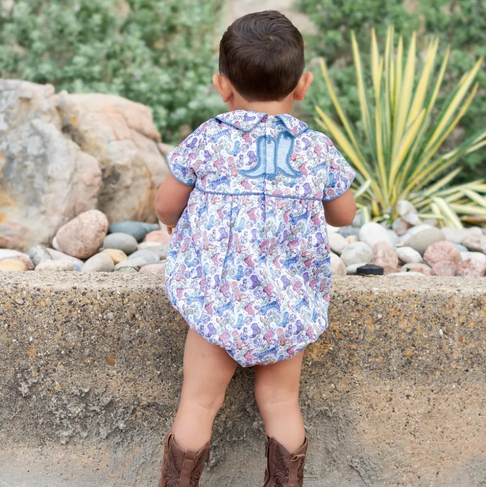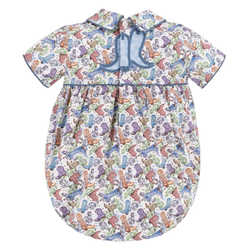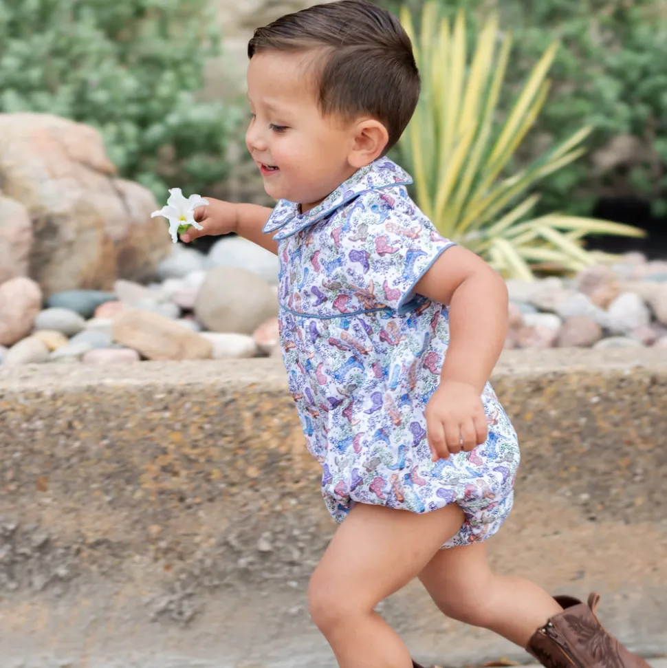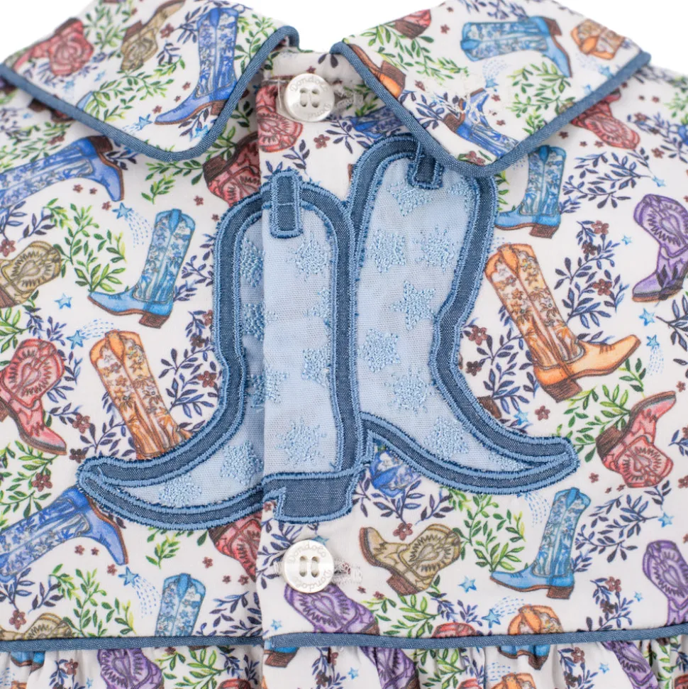 Inspired by the beauty of motherhood, Dondolo is a luxury lifestyle brand that provides beautiful, heirloom-quality clothing for generations to come. Each design is thoughtfully crafted in Colombia with ethical manufacturing, making every piece even more special. A fresh take on a beloved silhouette, the Reid Boy Bubble captures the spirit of Dondolo’s bestselling Dallas Collection with charming new details. The back features embroidered boots adorned with blue accents and stars—an ode to the Lone Star State—while a classic Peter Pan collar adds a sweet, nostalgic finish. Designed for coordinating sibling moments, this heirloom piece makes every day a little more magical.