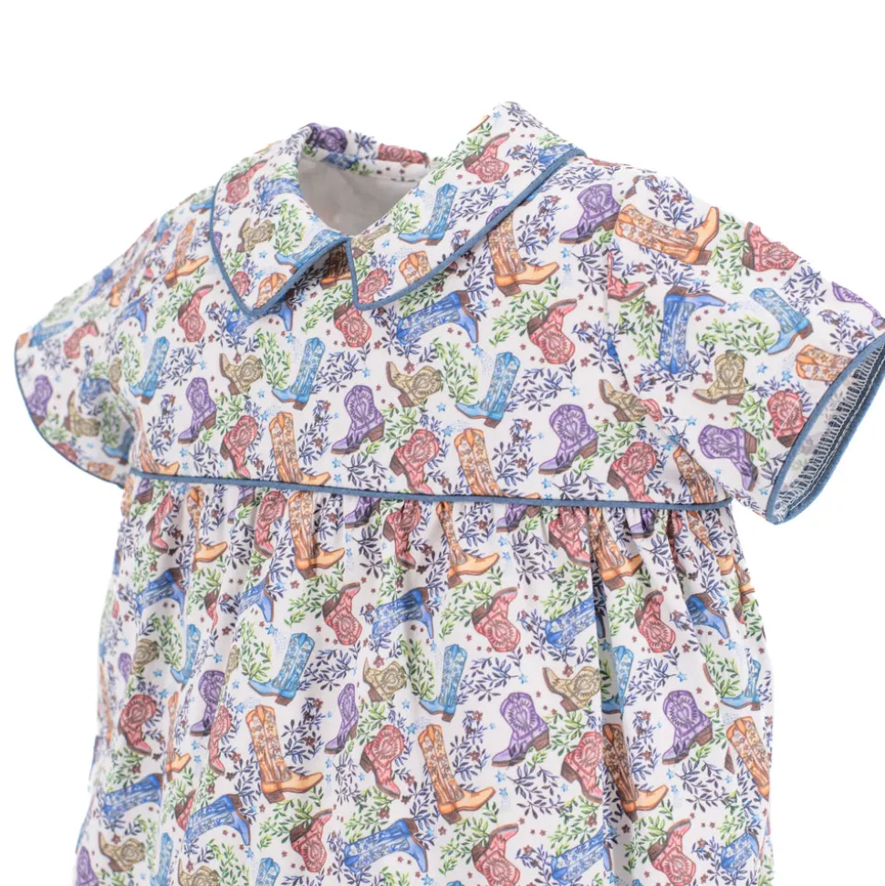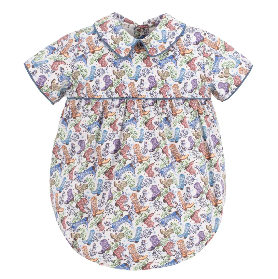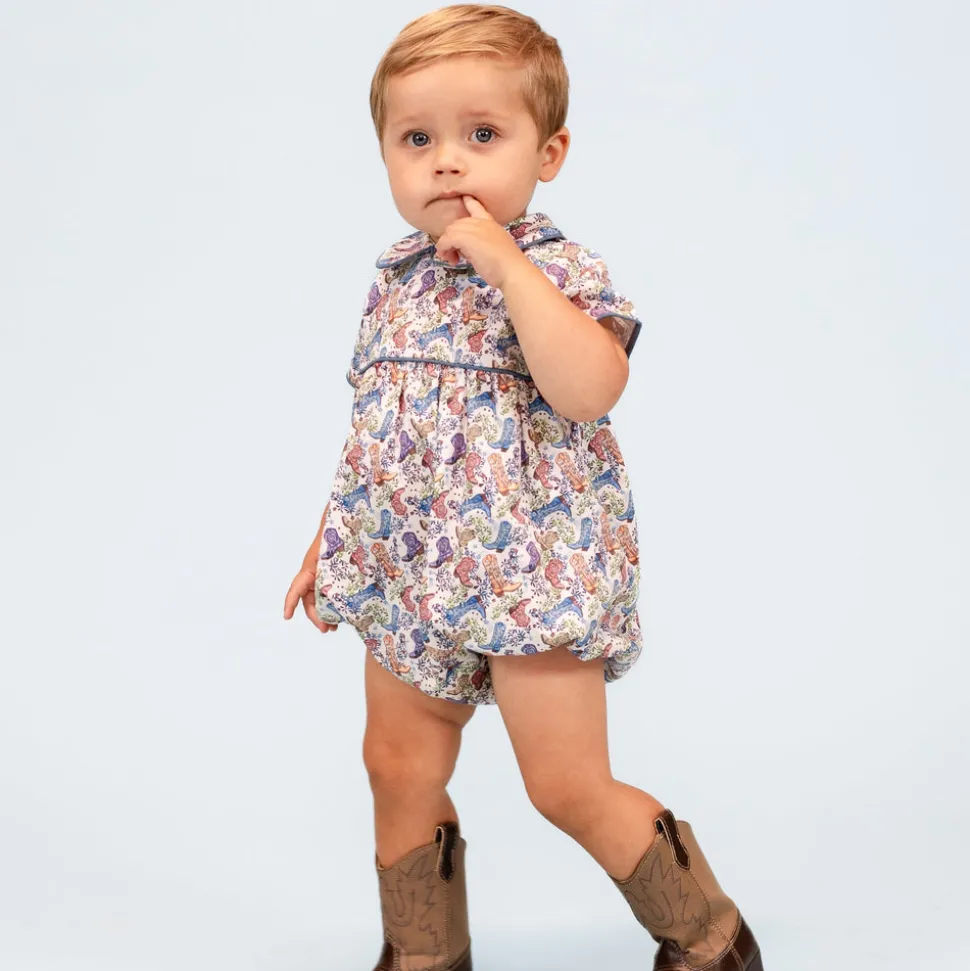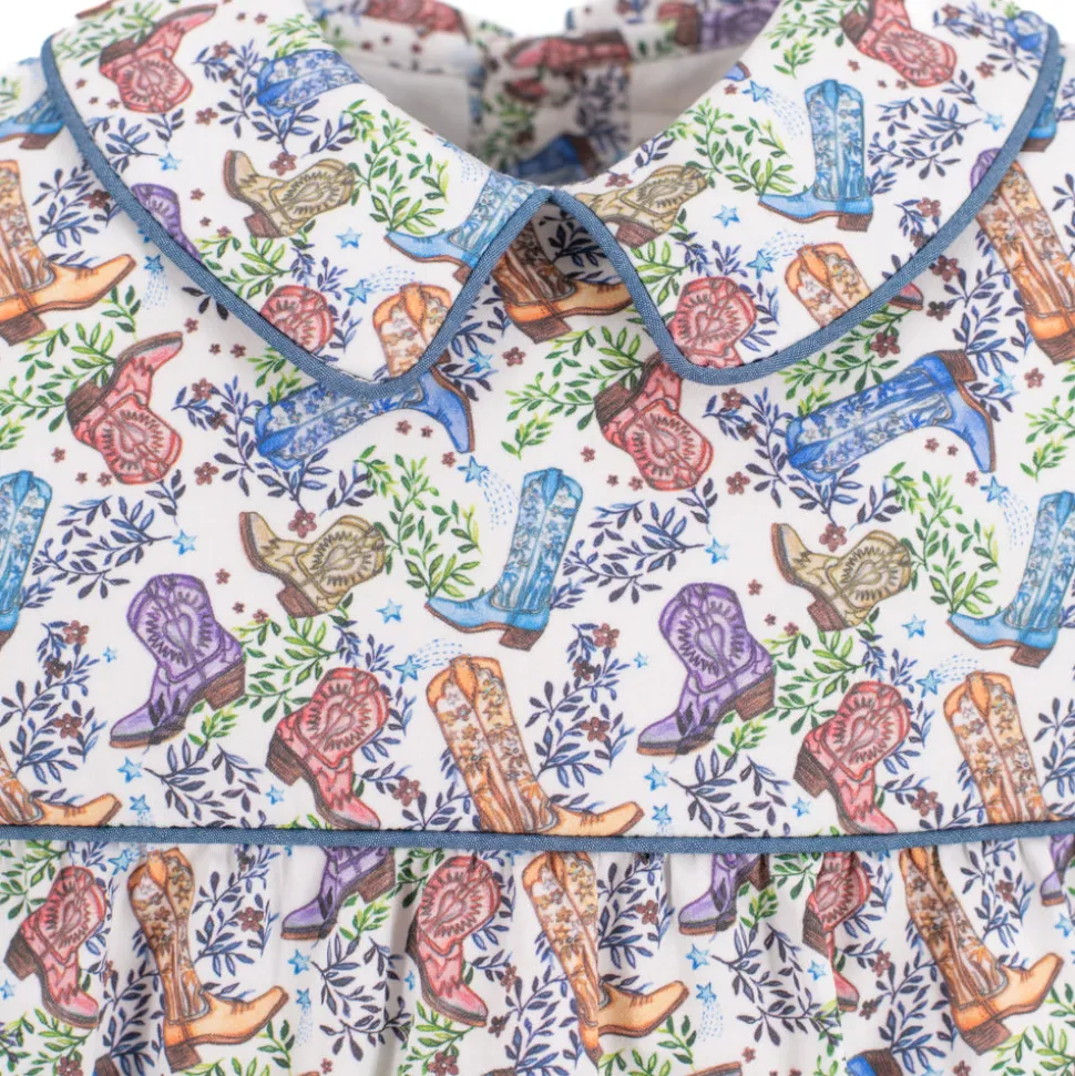 Inspired by the beauty of motherhood, Dondolo is a luxury lifestyle brand that provides beautiful, heirloom-quality clothing for generations to come. Each design is thoughtfully crafted in Colombia with ethical manufacturing, making every piece even more special. A fresh take on a beloved silhouette, the Reid Boy Bubble captures the spirit of Dondolo’s bestselling Dallas Collection with charming new details. The back features embroidered boots adorned with blue accents and stars—an ode to the Lone Star State—while a classic Peter Pan collar adds a sweet, nostalgic finish. Designed for coordinating sibling moments, this heirloom piece makes every day a little more magical.
