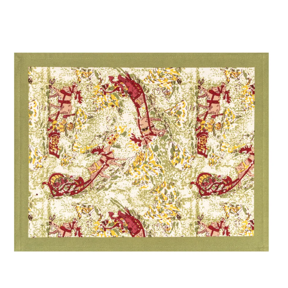 Idyllic landscapes, sumptuous colors, and the vibrant beauty of Southern France describes Couleur Nature. This brand of hand-painted table linens aims to bring a Provençal sense of effortlessness, rich culture, and joie de vivre to your life and home—no matter where you live. Embrace the magic of wintry landscapes and a brisk chill in the air with the Renne Reindeer Mats in Red & Greem, Set of 6. This charming pattern reveals enchanting reindeer and playful children sledding through snow will give your table a jovial look for the winter season. Fine French table linens, hand-printed, these table placemats are a great way to refresh your table, adding color and vibrancy to every day or formal settings. Designed exclusively for Couleur Nature by Parisian artist Bruno Lamy.