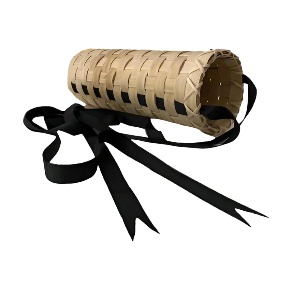 100% Rattan. Ribbon. Designed and hand-crafted by Erin and Peggy Pollard. Beautiful color variation from the natural rattan fibers. Made in United States.