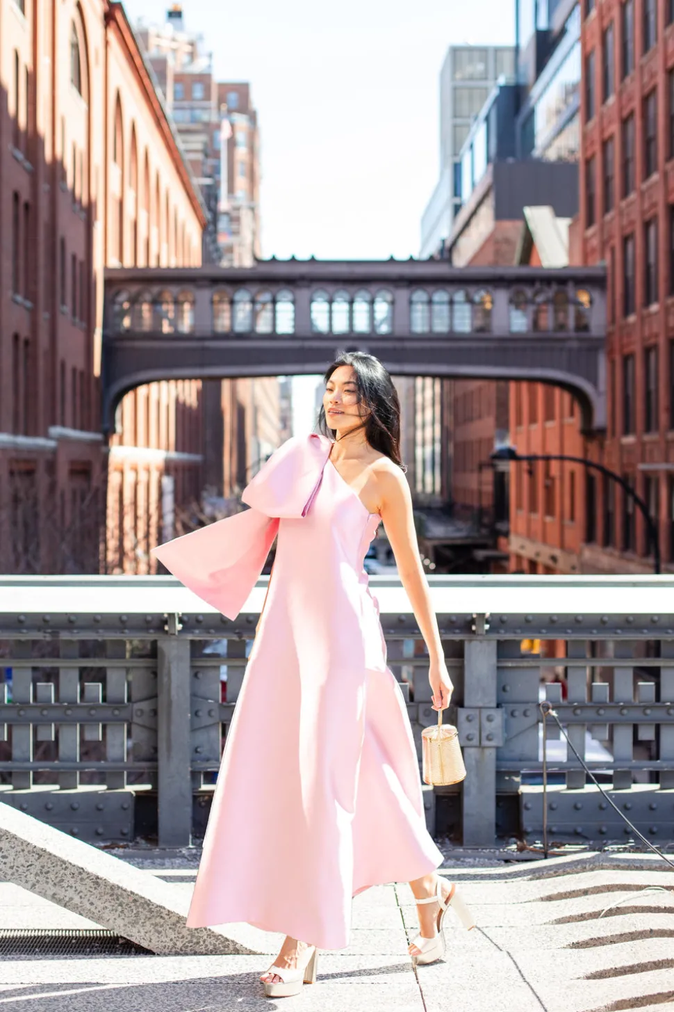 MAE New York seeks to revitalize New York’s historical garment district by creating small-batch and made-to-order collections—modern interpretations of 1960s glamor—highlighting tailoring, luxury materials, and craftsmanship. Crafted in a luxurious silk blend, the Rita Gown in Blossom Pink is a mikado beauty boasting an easy one shoulder silhouette, vibrant coloration, and a chic, oversized bow. So elegant, and not without fun.