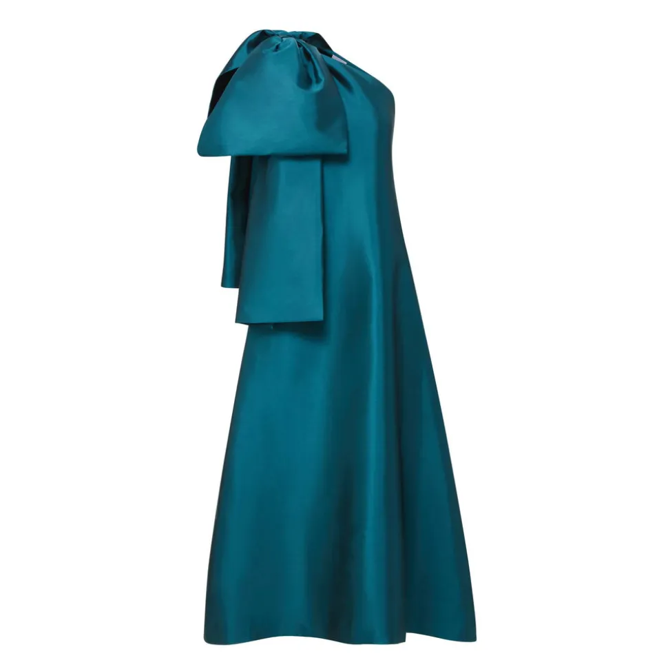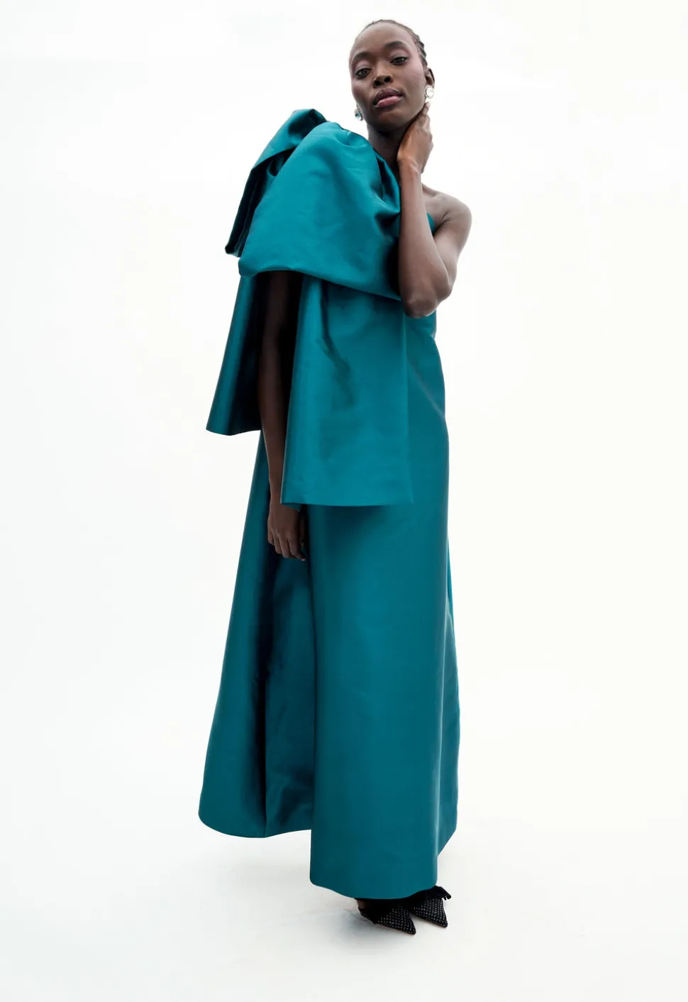 MAE New York seeks to revitalize New York’s historical garment district by creating small-batch and made-to-order collections—modern interpretations of 1960s glamor—highlighting tailoring, luxury materials, and craftsmanship. Crafted in a luxurious silk blend, the made-to-order Rita Gown is a silk wool twill beauty boasting an easy one shoulder silhouette, vibrant coloration, and a chic, oversized bow. So elegant, and not without fun.