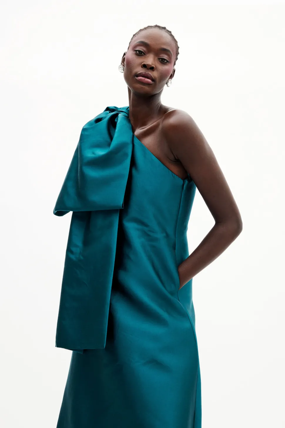 Body: 51% silk, 49% wool. One shoulder silhouette with oversized hand tied bow (not removable). Fitted through bodice, easy through hips and skirt. Made in New York City.