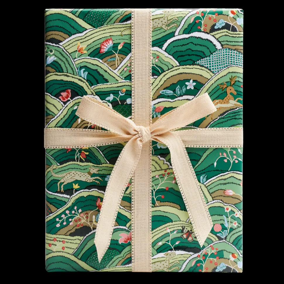 Founded by Frederic Schumacher in 1889 on Fifth Avenue in New York, Schumacher design transcend trends and time with generations-tested unwavering devotion to beauty and quality. Their luxury pillows, fabric, wallpaper, furniture, and paper products allow decorators and shoppers alike to create with total confidence. Decorated with a pattern filled with fantastical animals that gambol across a naively endearing landscape, the Rolling Hills Wrapping Paper In Green makes every gift exceptional.