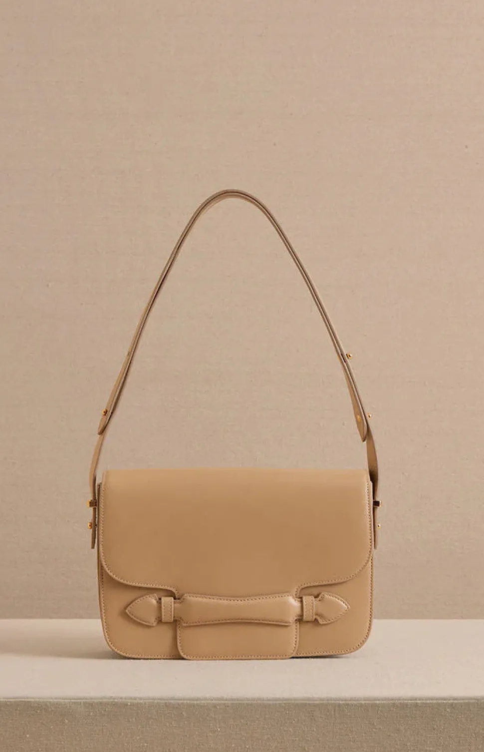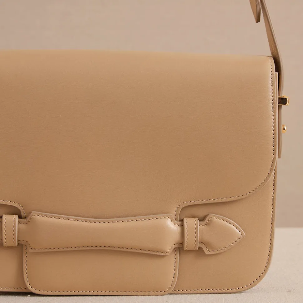 Box Calf Palmellato leather exterior. Lambskin suede lining in natural beige. Adjustable strap with signature collar studs. Rear, front, and interior pockets. Made in Italy.