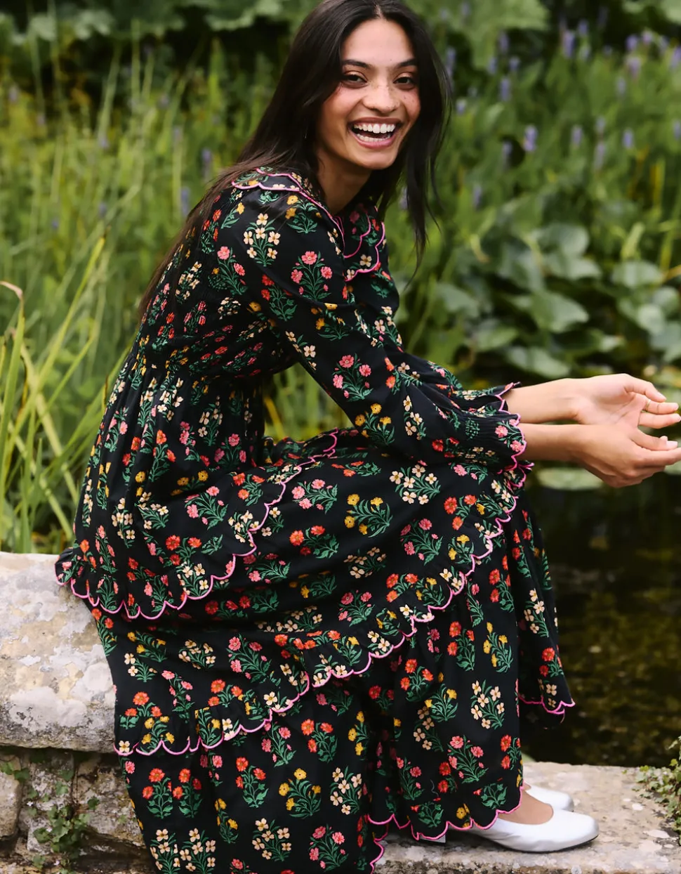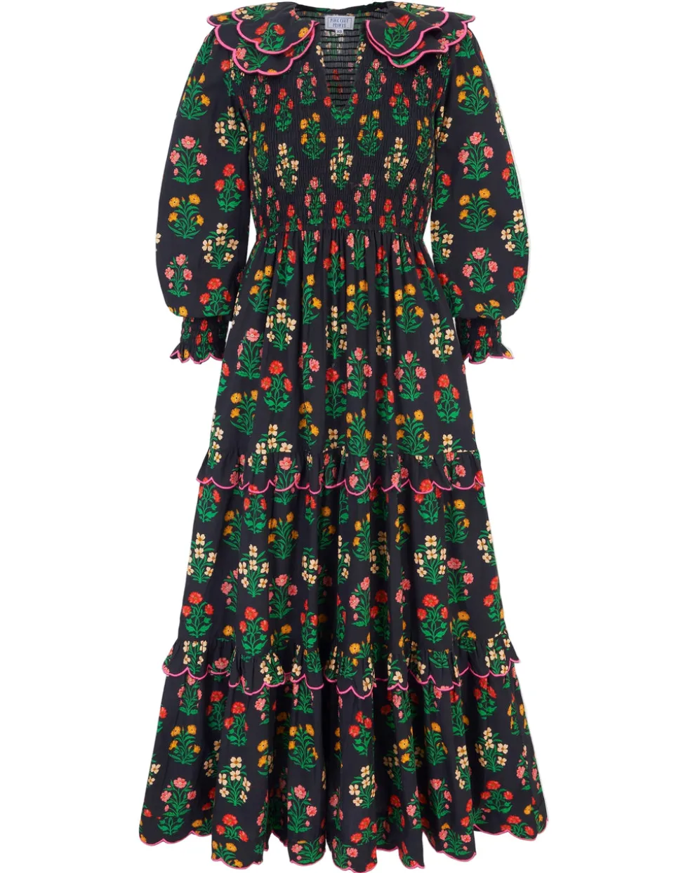 Color and creativity are the foundations of Pink City Prints, a brand inspired by founder Molly Russell’s life in Jaipur. In her inimitable dresses, you’ll find centuries of craft knowledge, expressed through unmatched quality and traditional techniques, like hand embroidery, block printing, and hand-looming. The Rose Buta Rita Dress is a joyful mix of style and wearability, finished with an oversized scalloped collar, contrasting pink scallop tiers through the skirt, and a comfortable smocked body. Effortlessly cool and endlessly versatile, it’s ideal with boots for everyday adventures yet special enough for the party season.