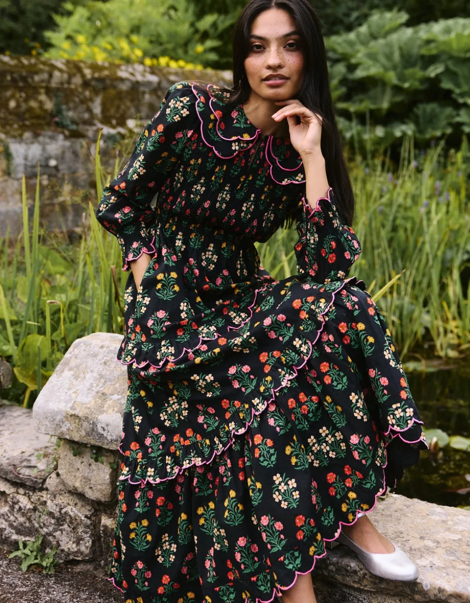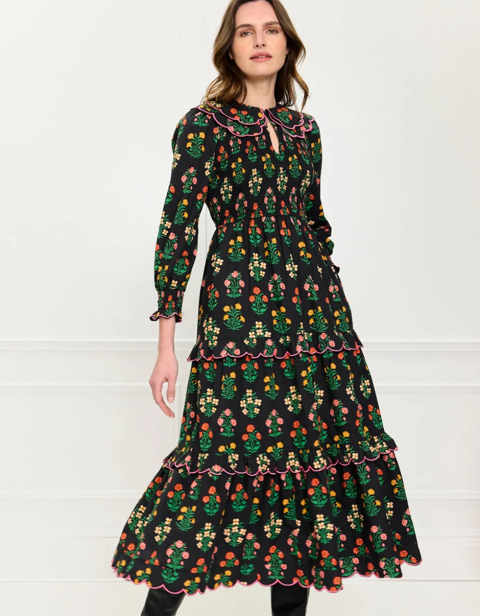 100% cotton. Hand-printed with rose buta motif. Oversized scalloped collar. Contrasting scallop tiers. Smocked body. Made in India.