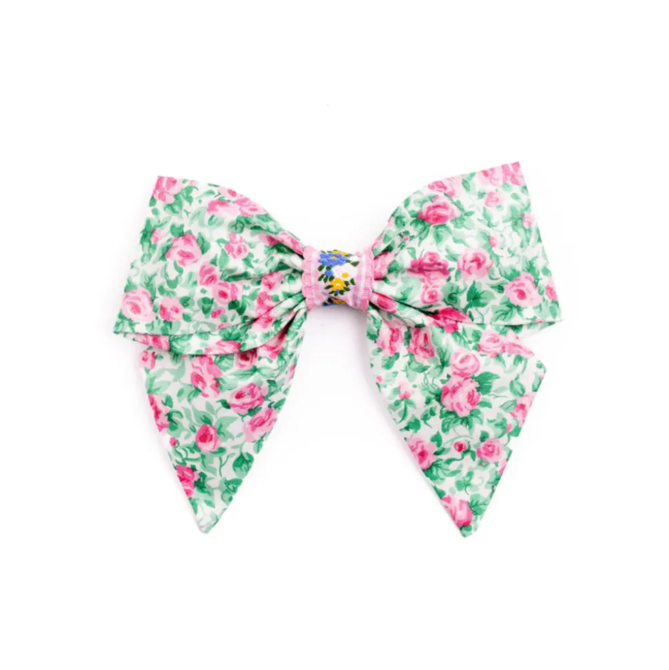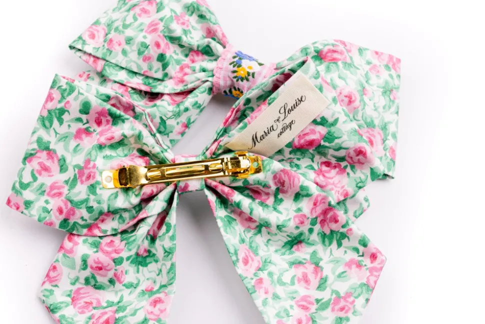 Maria Louise Cottage is a cozy haven steeped in history and charm. Once a humble milk room from the early 1900s, this space has been lovingly transformed into a workshop of creativity and craftsmanship. Every item here is meticulously handmade, infused with care and attention to detail. We use vintage fabrics, each carrying its own story, which means many of our creations are one-of-a-kind treasures available in limited quantities. The Rose Garden Bow in Green is made with vintage fabric and a pink gingham Jacquard ribbon from the 1960s. It has a French barrette type of closure.