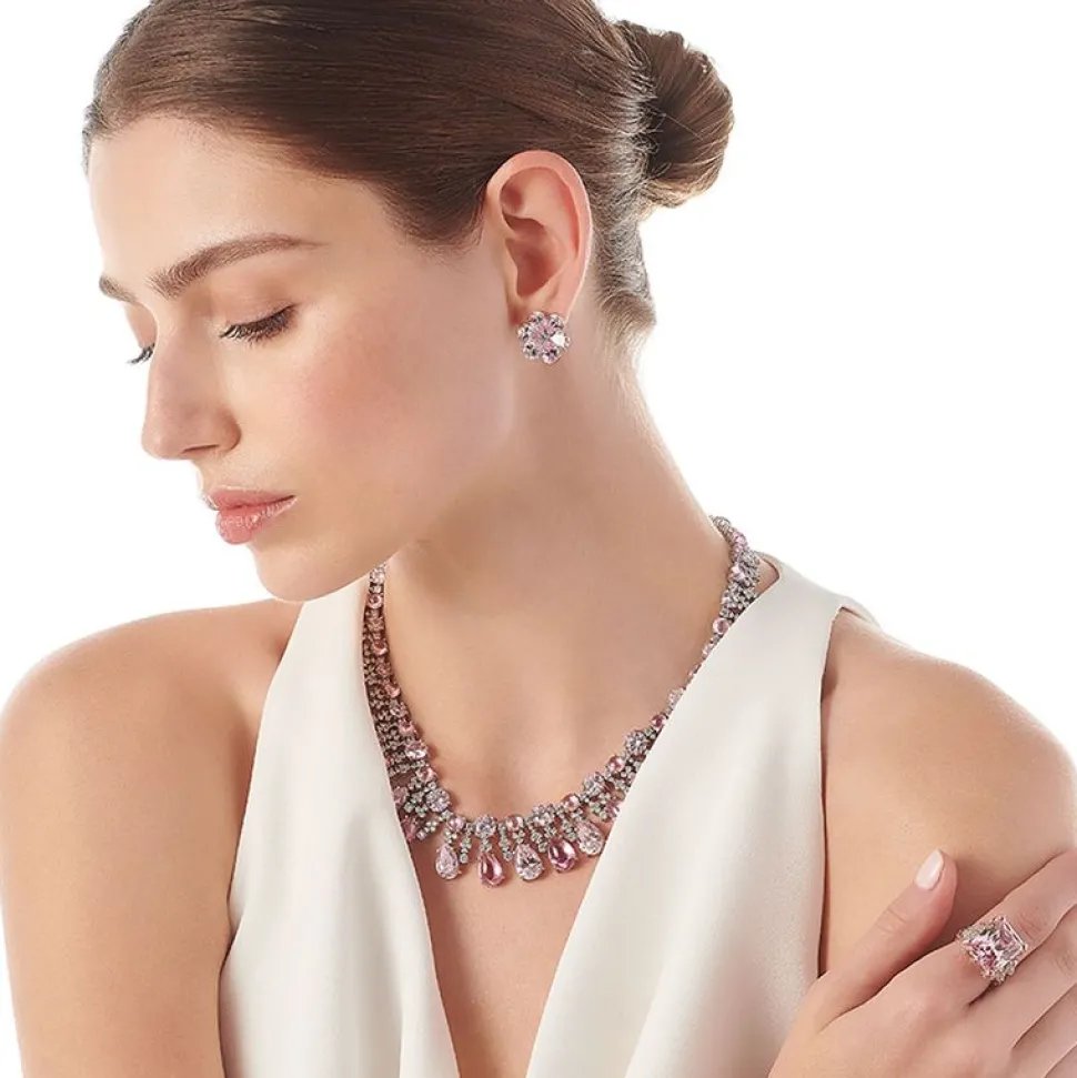 Materials: 18K white gold and rhodium vermeil, 14K gold posts. Simulated gemstones: Pink diamonds (carats): 23.1. Handcrafted in the United Kingdom.